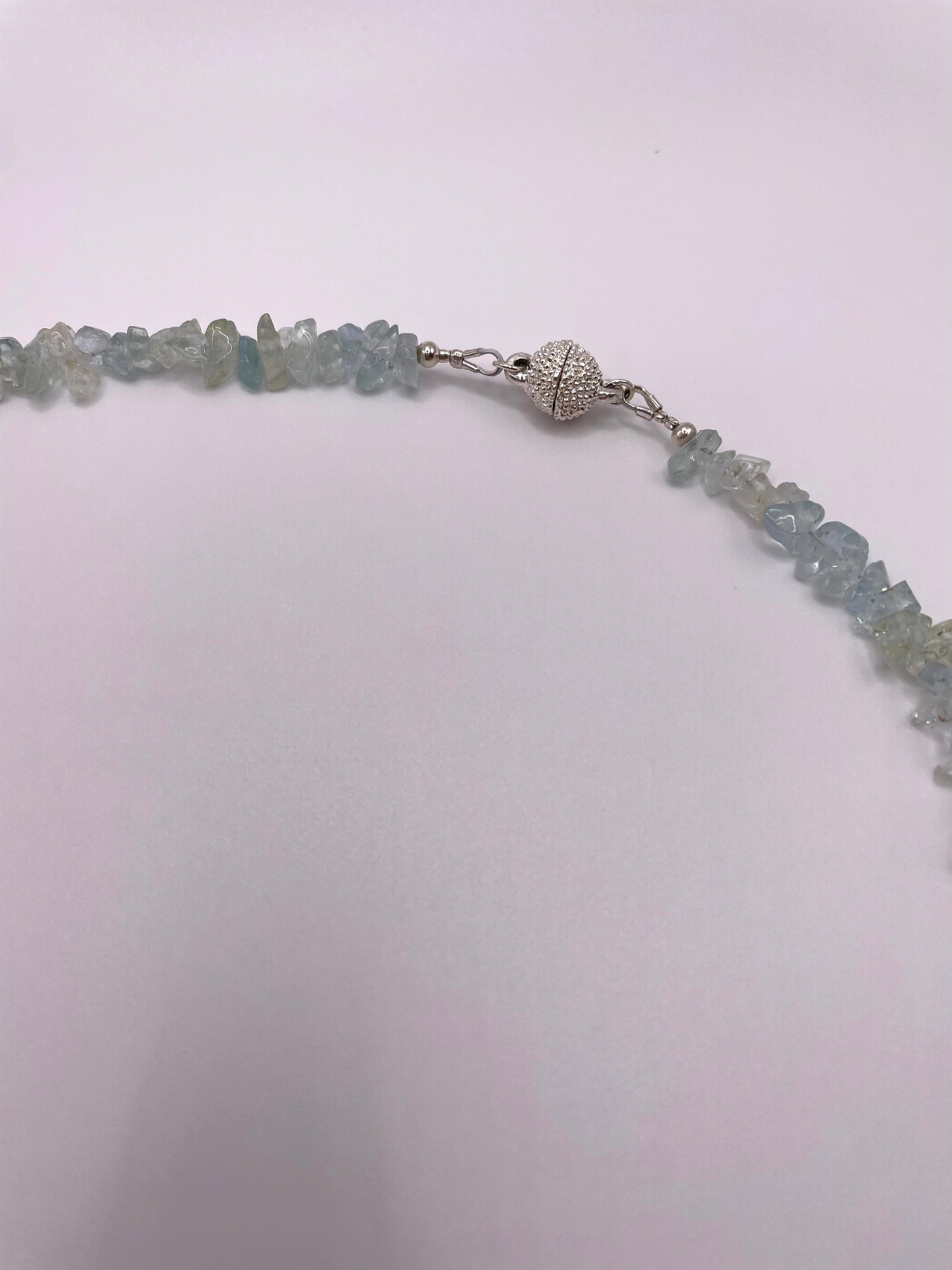 Aquamarin hilft uns, Einsicht, Wahrheit und Weisheit zu erlangen. Er kann verwendet werden, um den Geist, die Nerven und Ängste zu beruhigen. Die Farbe Blau steht für Ruhe und Zufriedenheit. Ein wertvoller Helfer für jeden Tag ist diese einzigartige Kette.