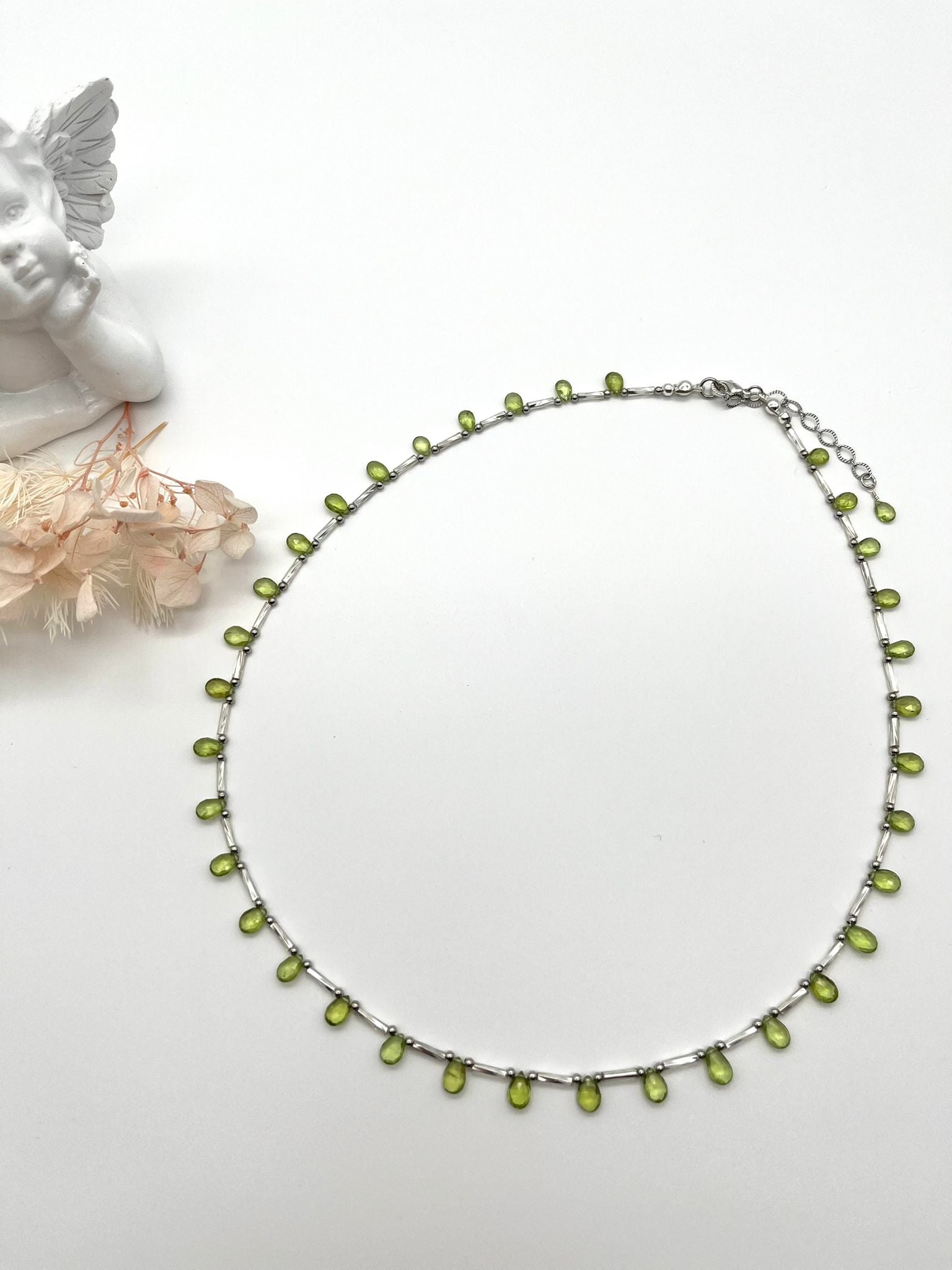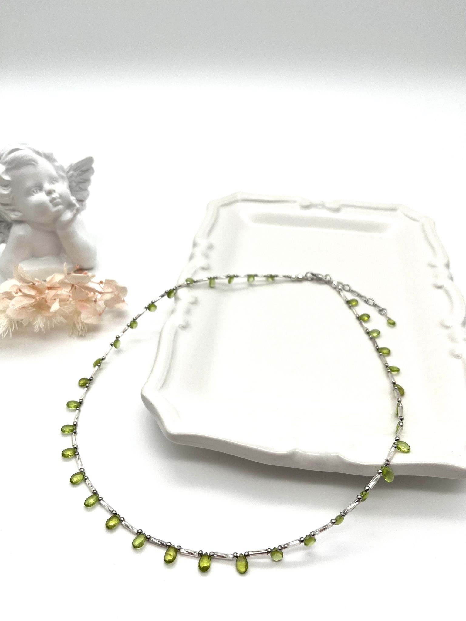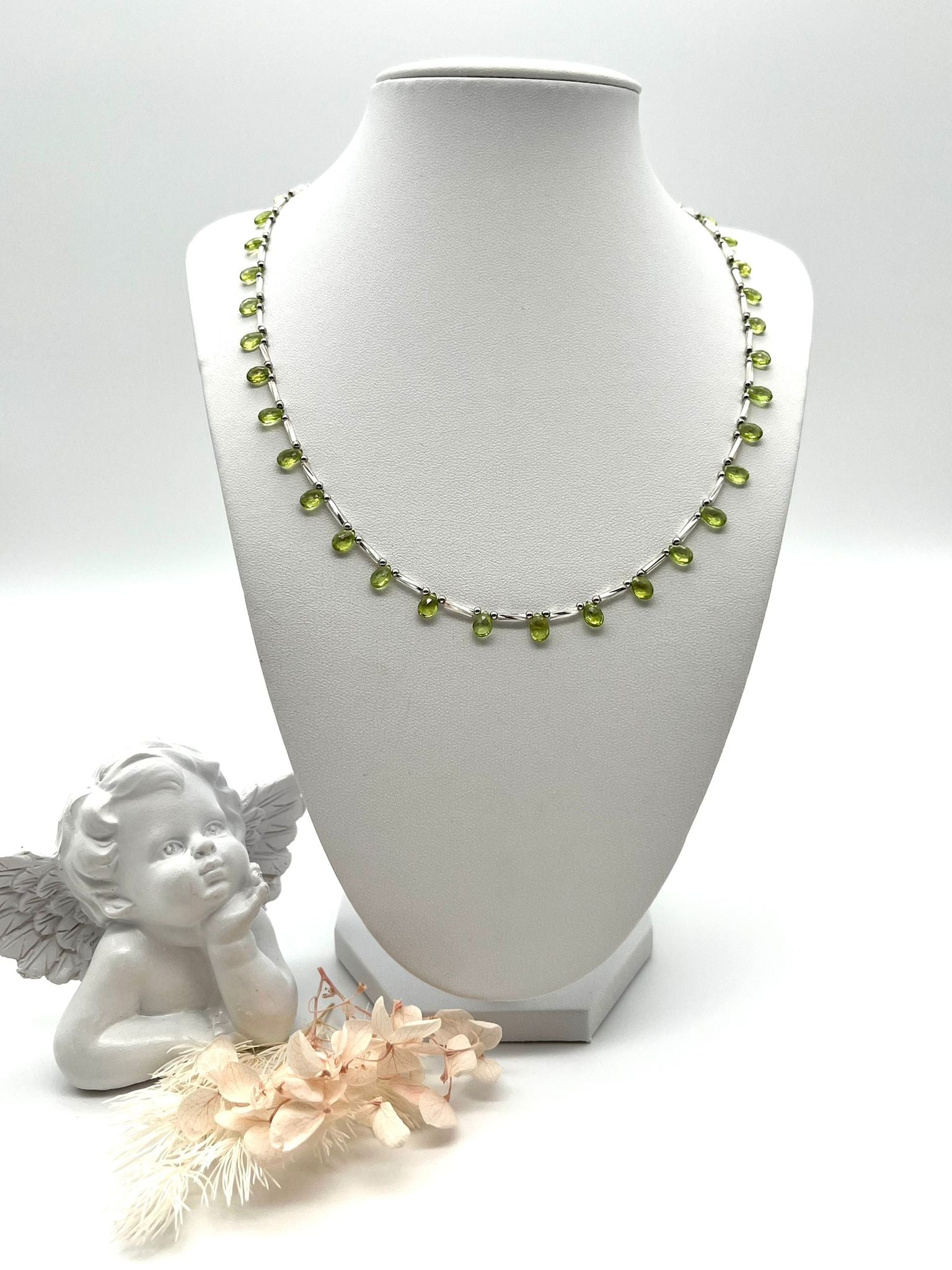 Dieses zarte Collier aus leuchtend grünem Chrysolith erinnert an eine feine Blume, deren kleine Tropfen wie Blütenblätter sanft um den Hals liegen. Die frische, natürliche Farbe wirkt leicht und lebendig und verleiht dem Schmuck eine elegante, feminine Ausstrahlung.