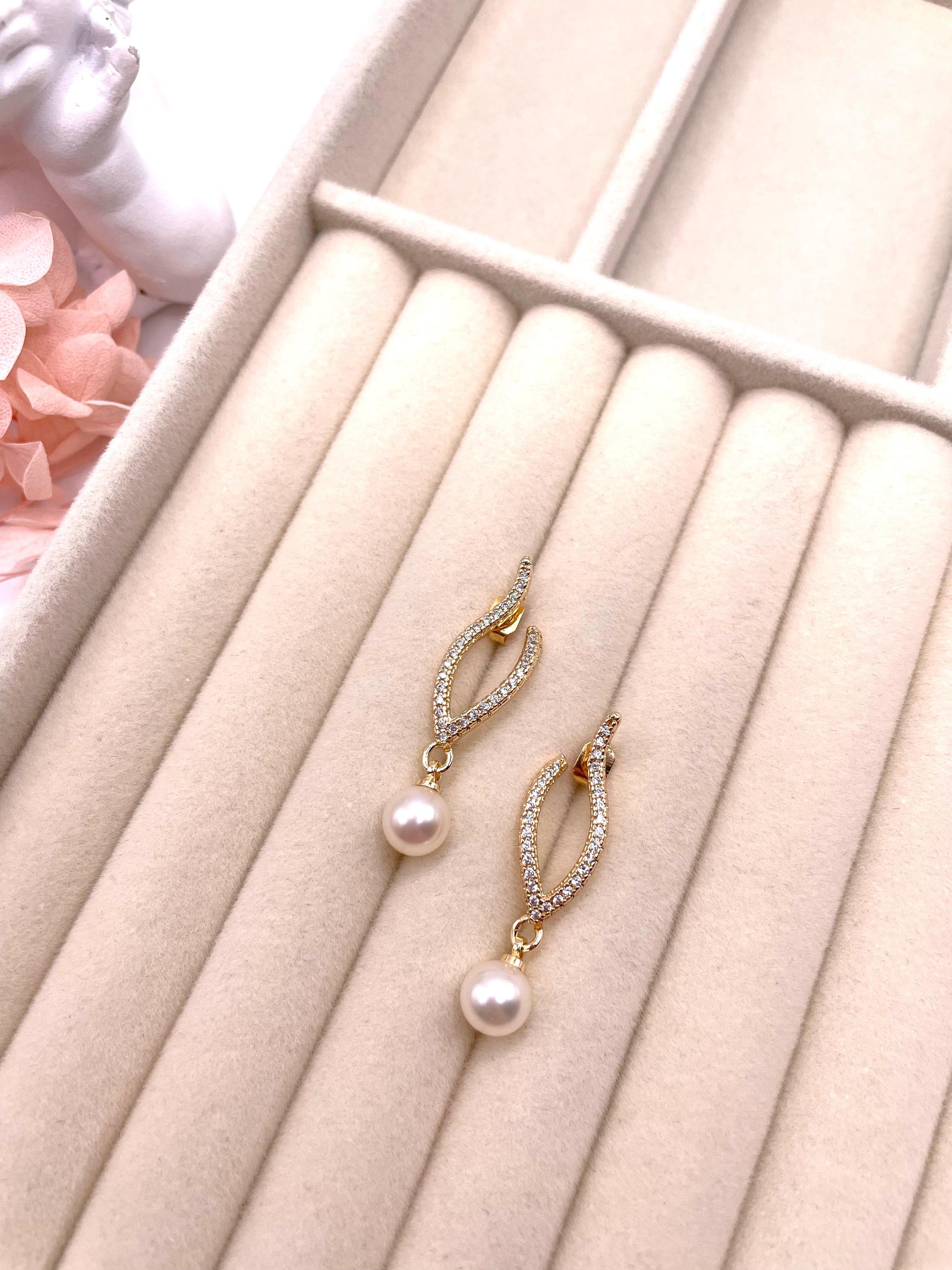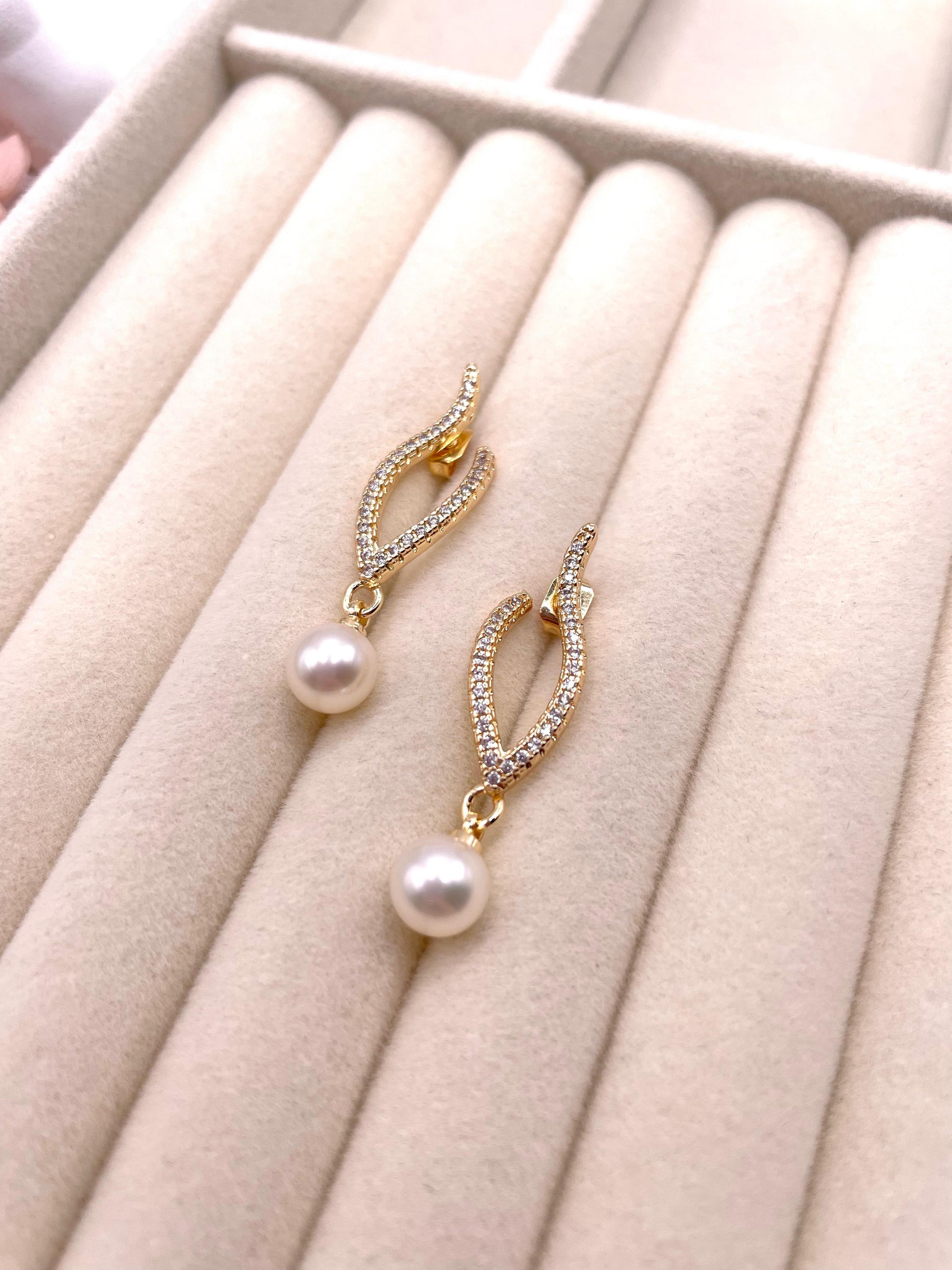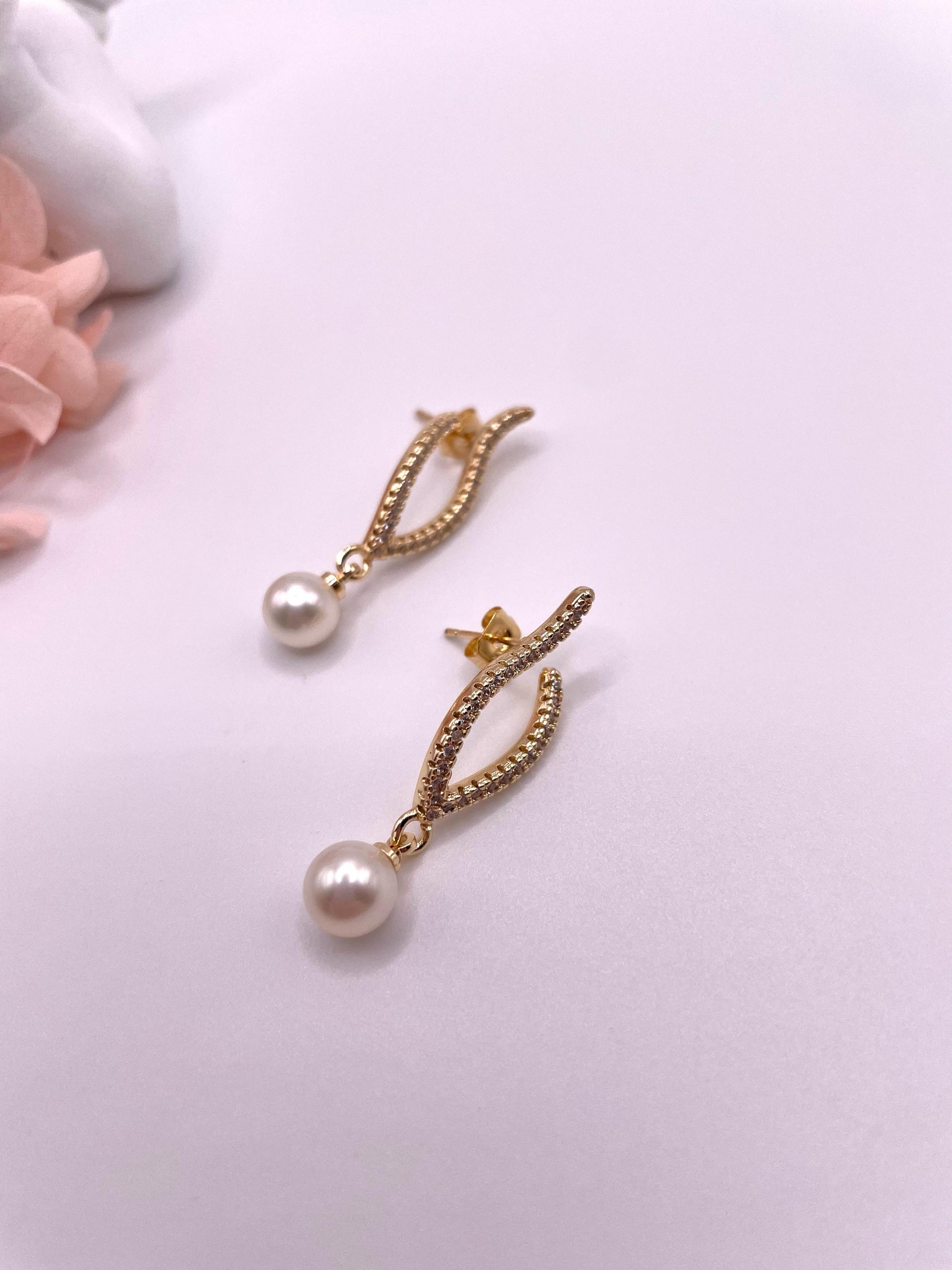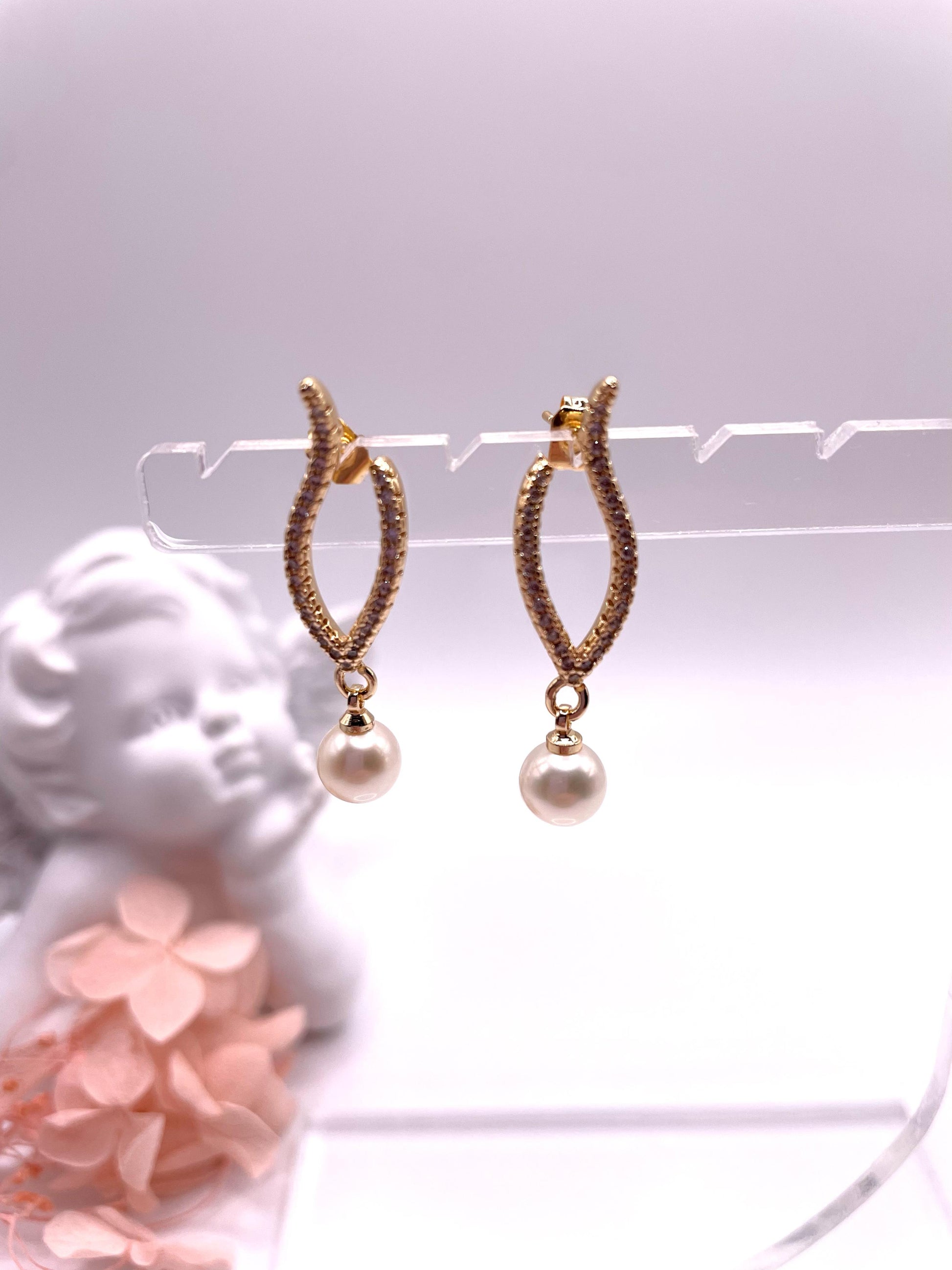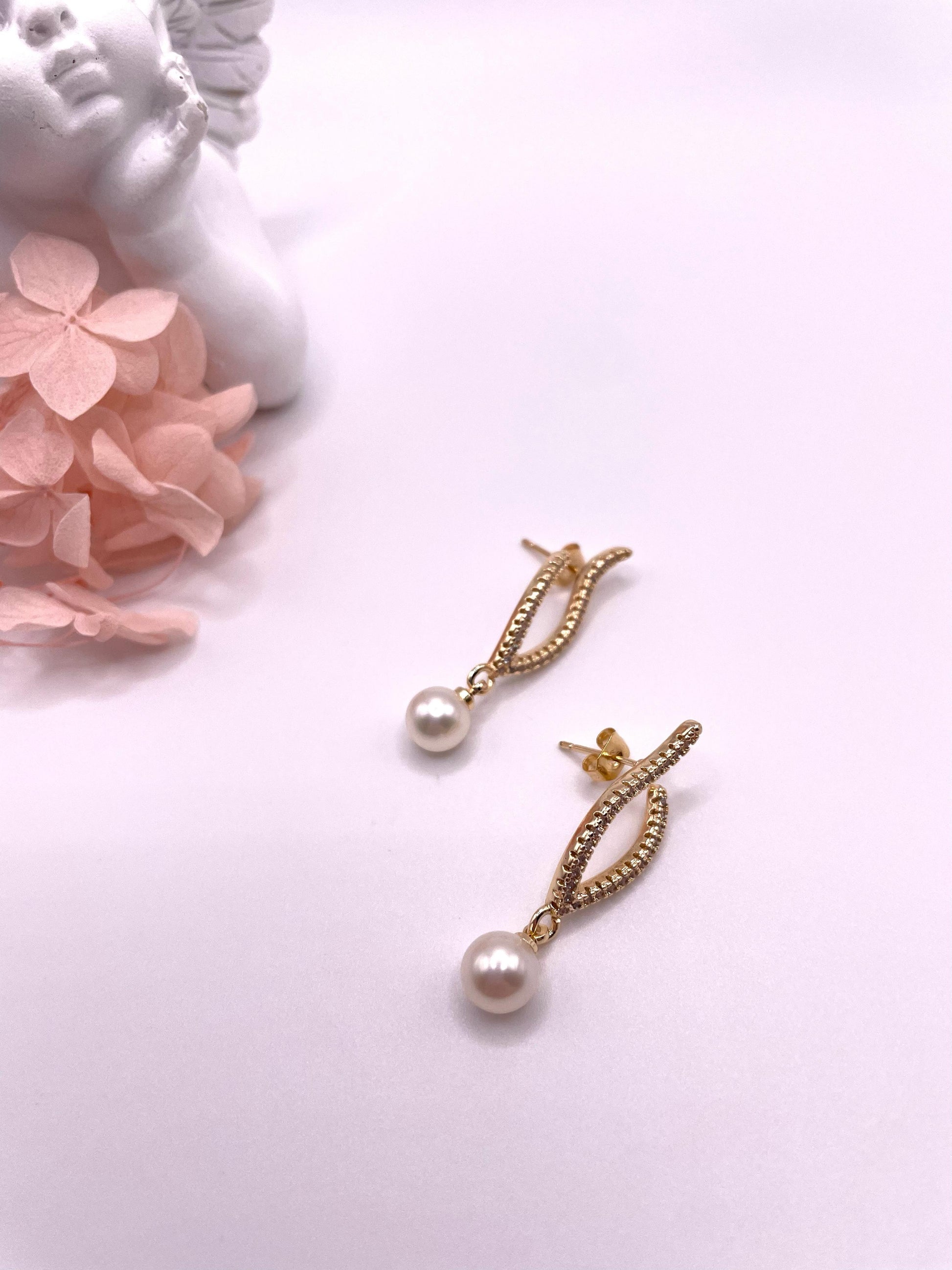 Wunderschöne Ohrringe, 18 kt vergoldet mit feinen Zirkonia Steinen und zarten Süßwasserperlen.