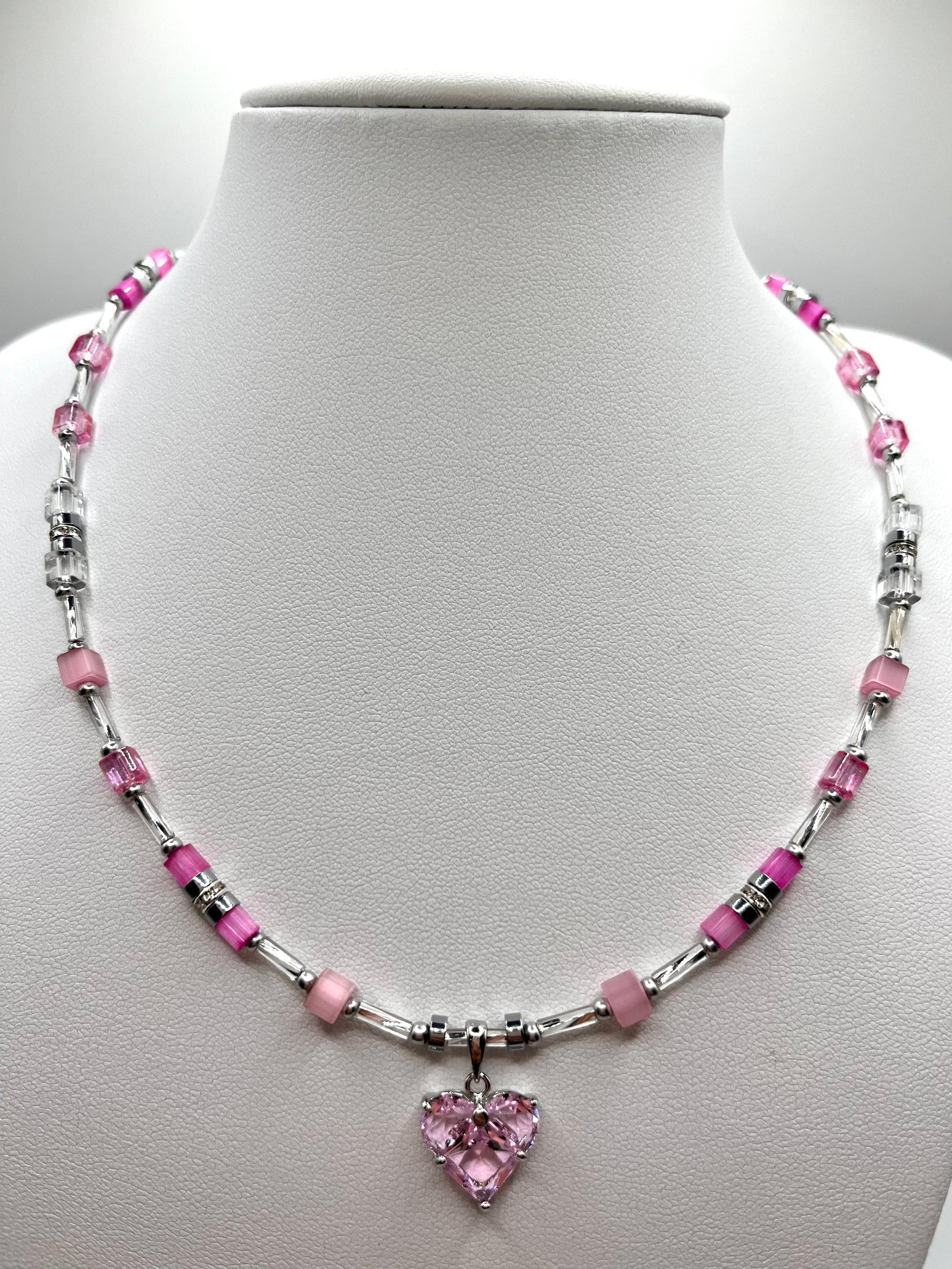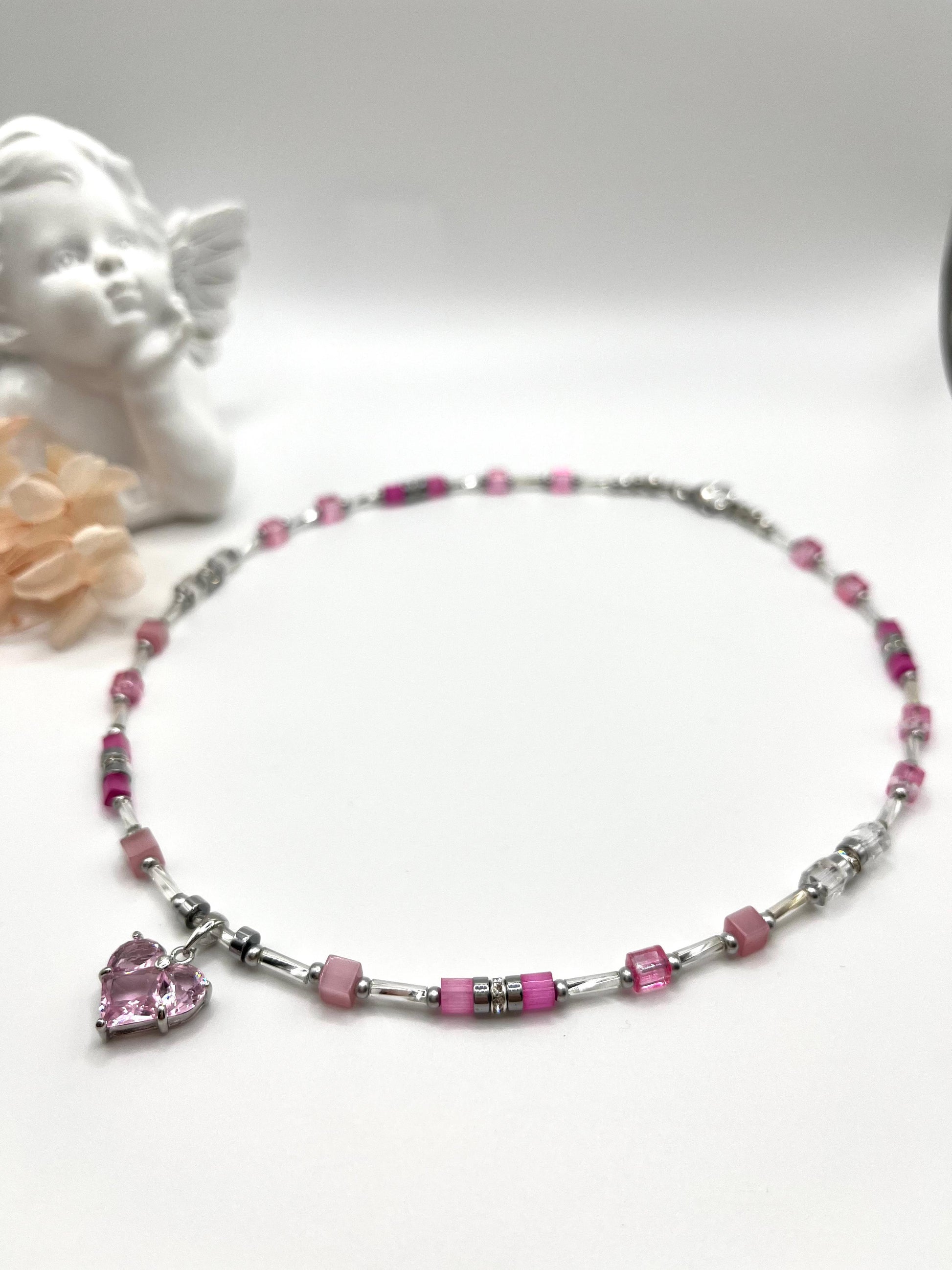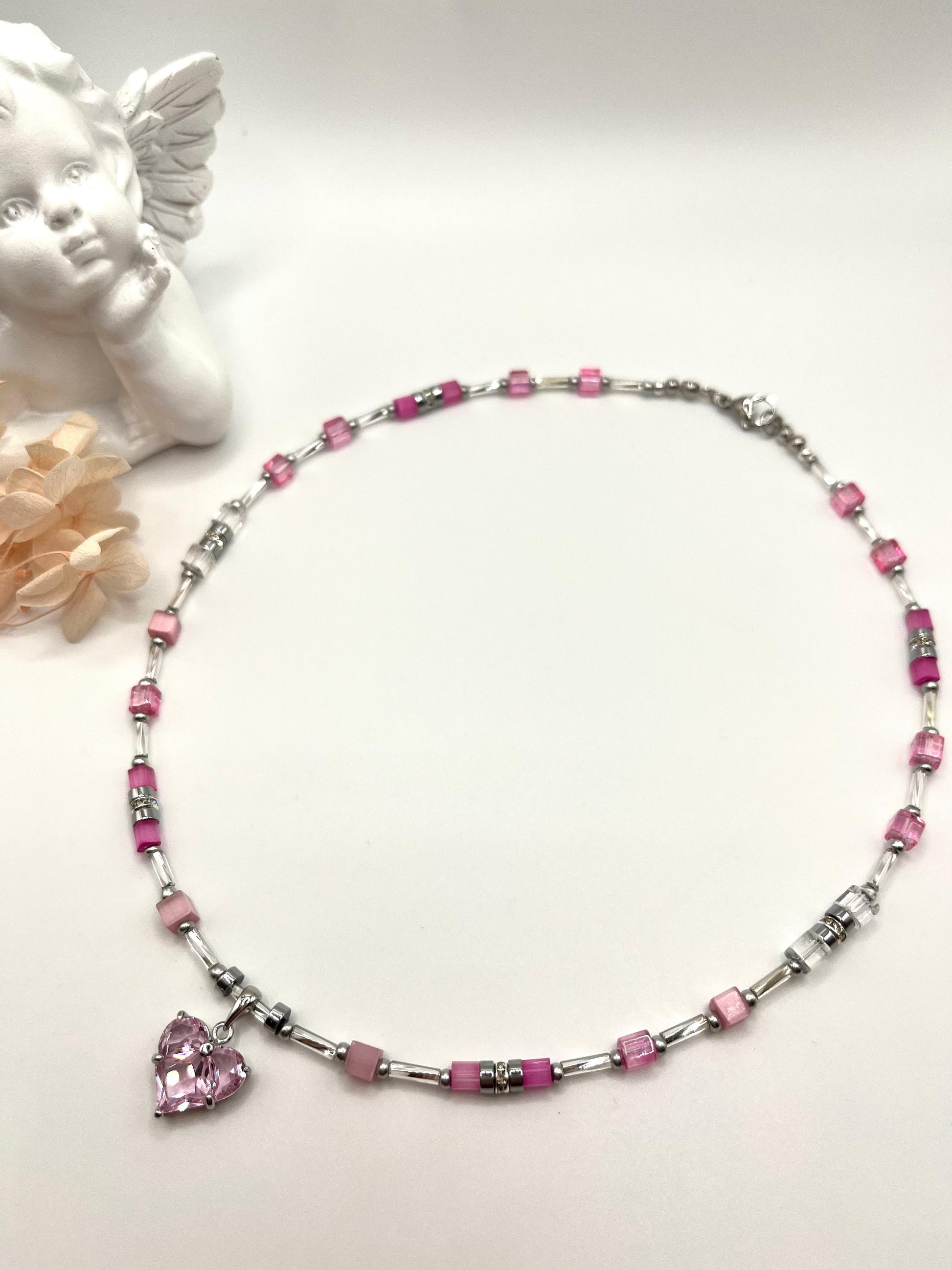 Leticia, zarte Kette mit rosefarbenen Glaswürfeln und Herz-Anhänger