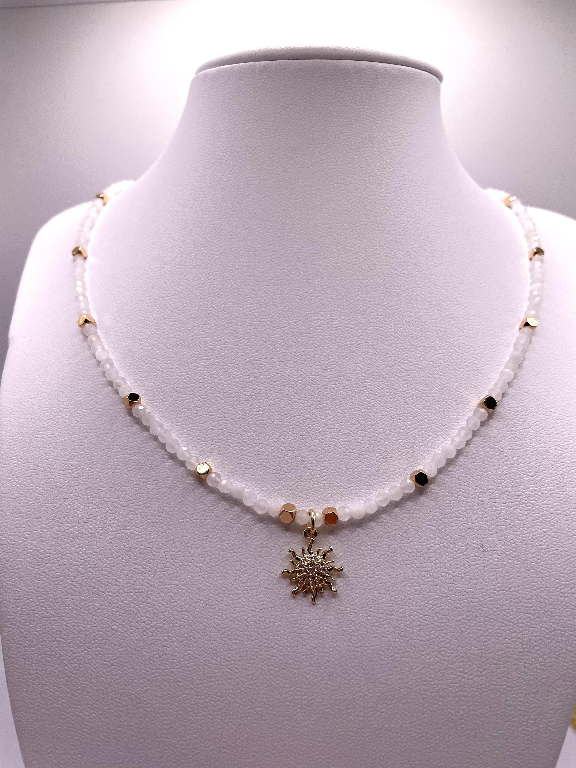 Eine zarte Kette aus feinen Mondstein Perlen. Als Zwischenperlen sind goldene Hämatit Perlen eingesetzt.