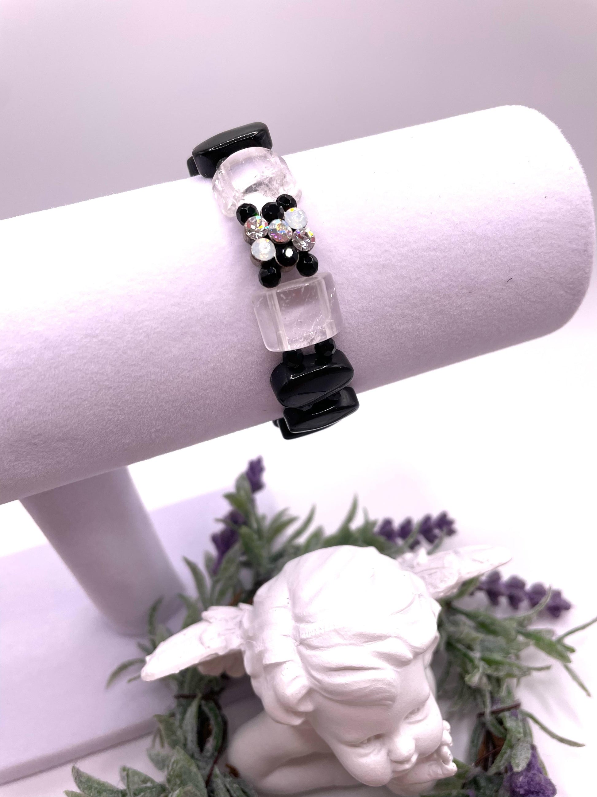 Der Onyx steht für innere Stärke, Schutz und Selbstbewusstsein, während der Bergkristall Klarheit, Energie und Ausgeglichenheit fördert. Gemeinsam bilden sie eine kraftvolle Kombination für Fokus und mentale Stärke – stilvoll und bedeutungsvoll zugleich.