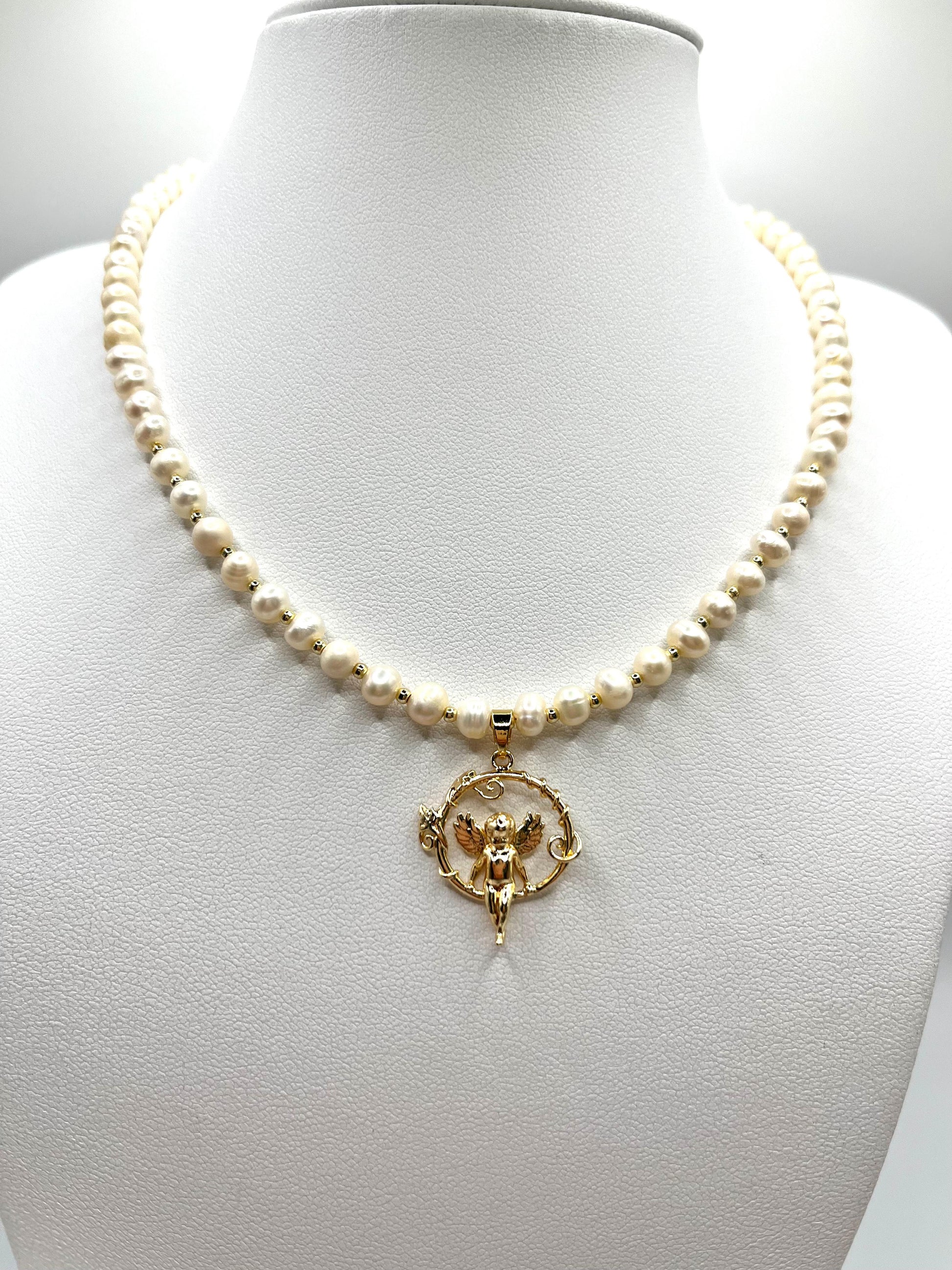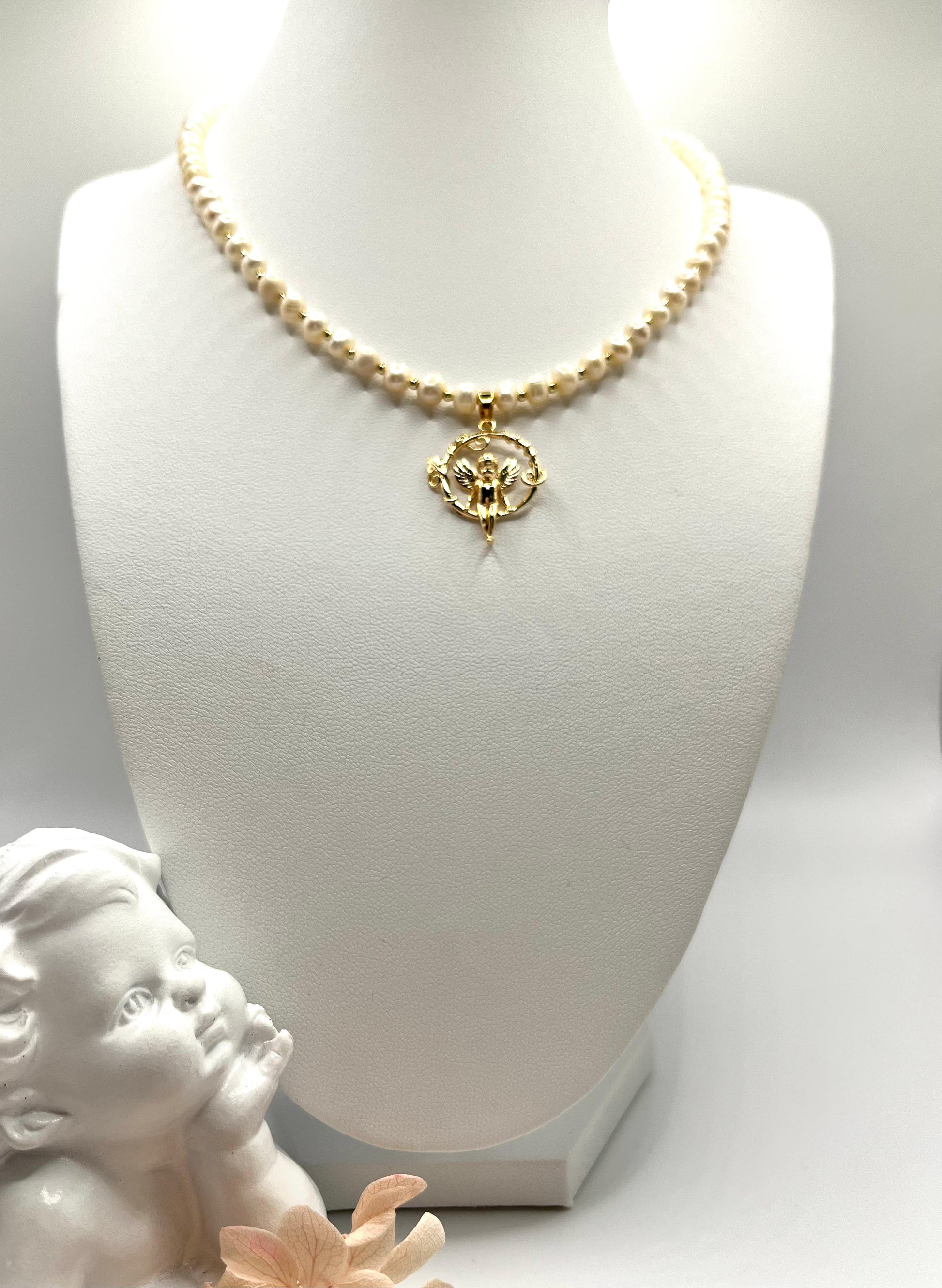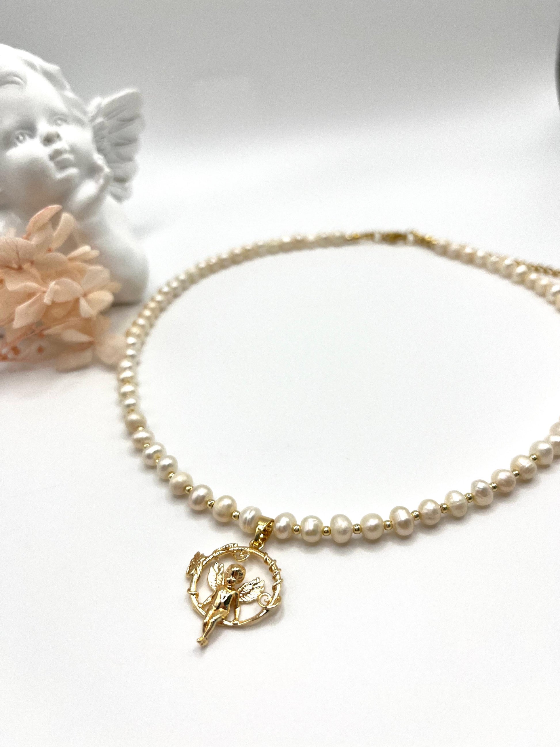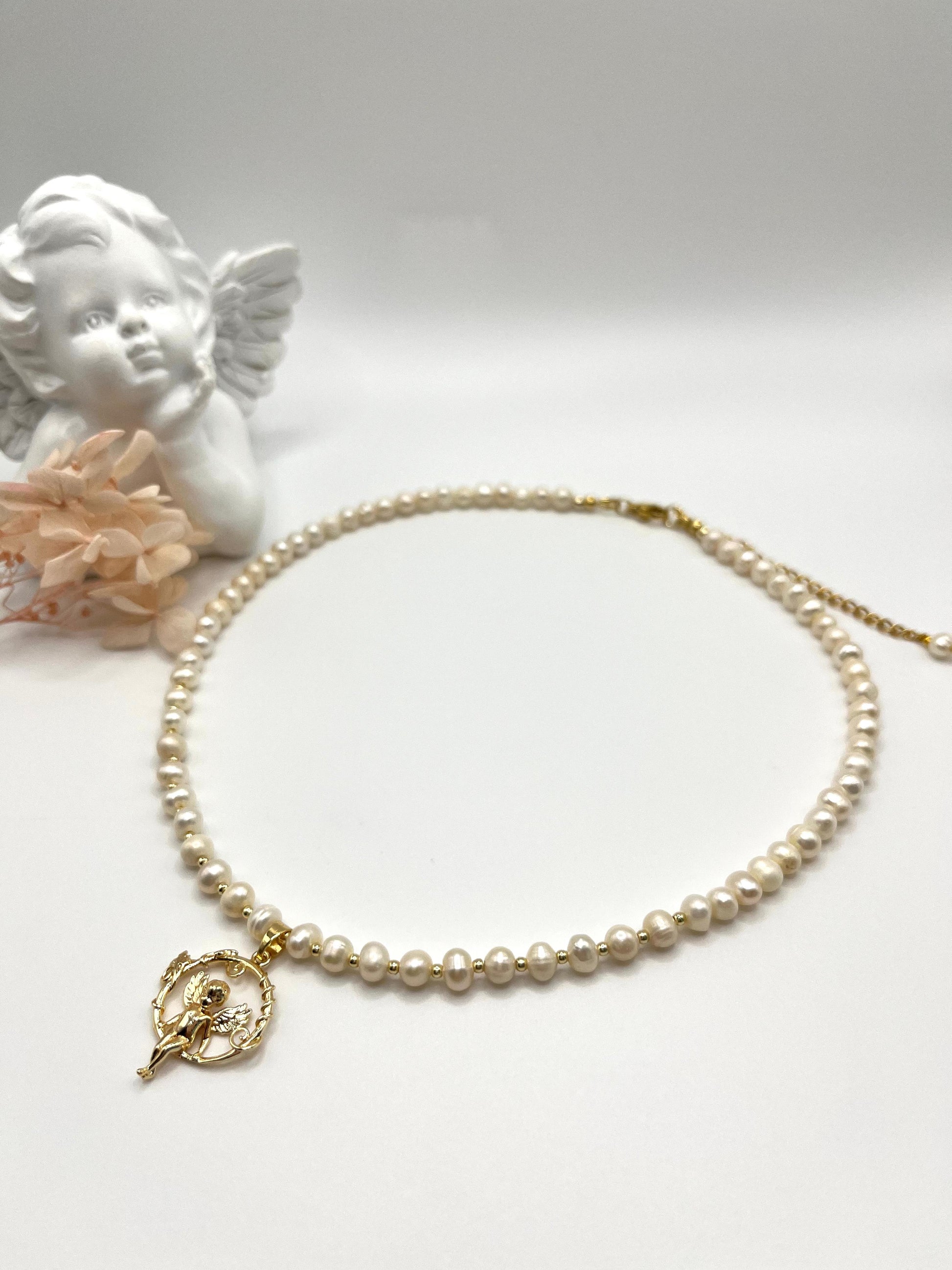 Perlenkette, echte Süßwasserperlen mit Engel-Anhänger für junge Dame