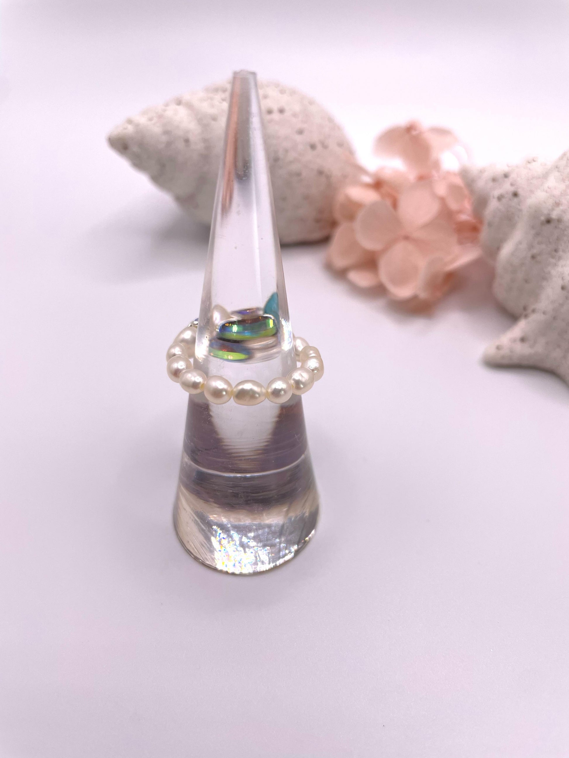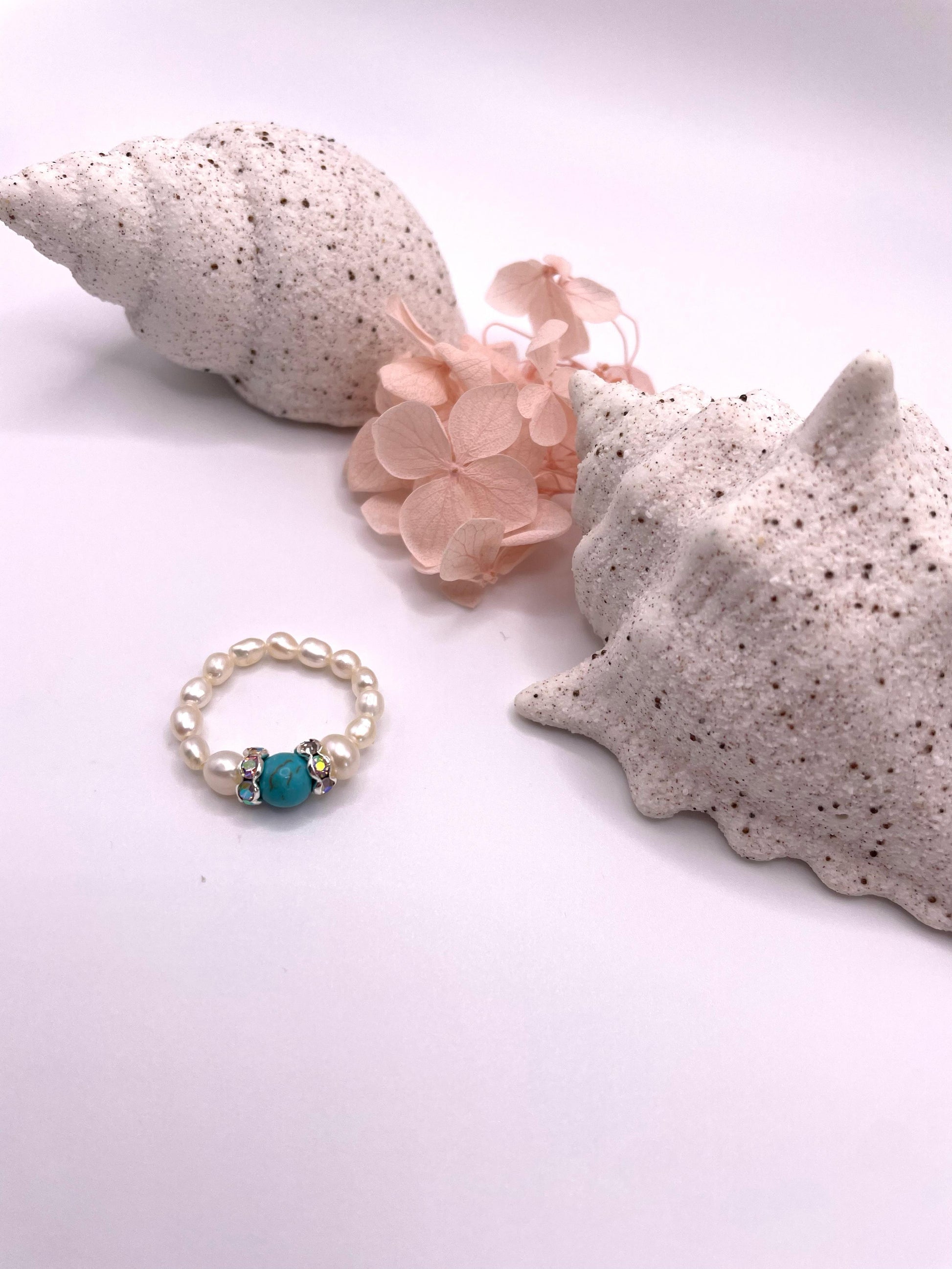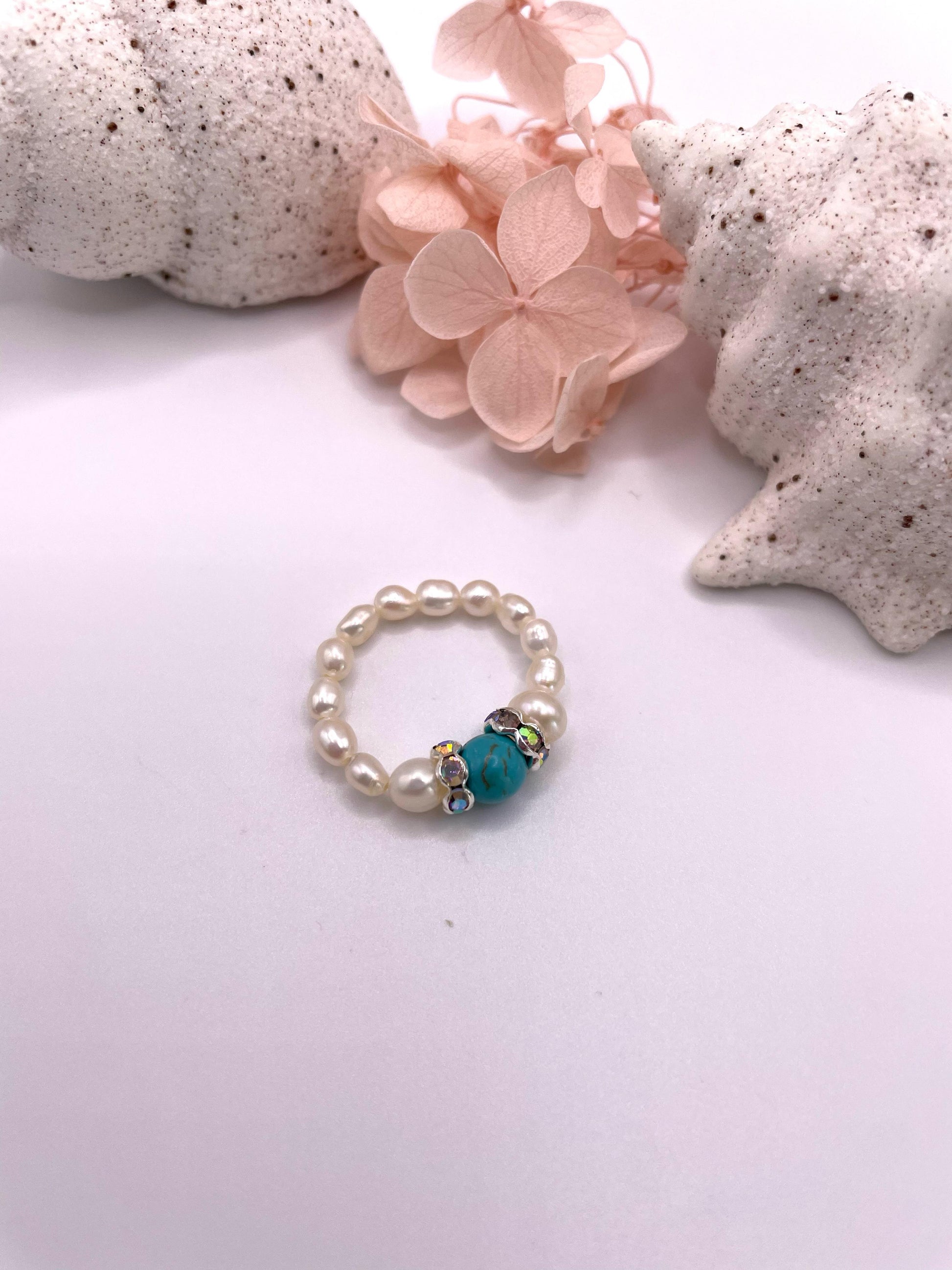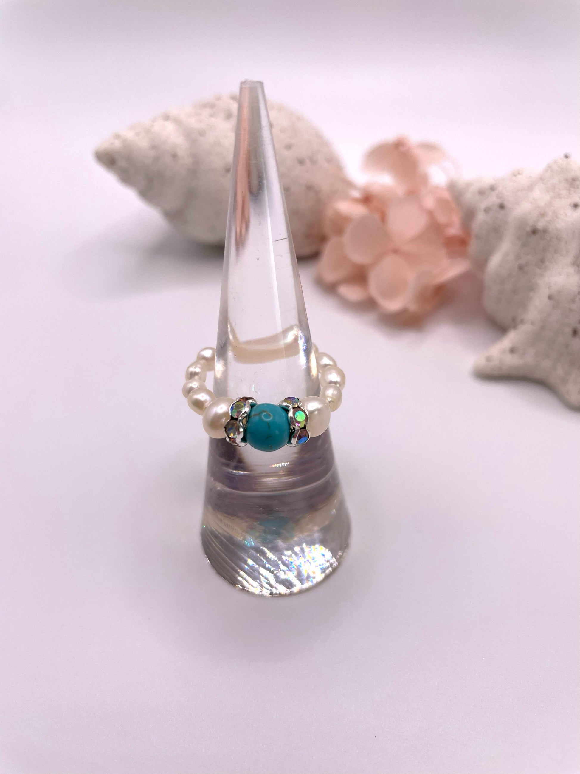 Dieser fein gearbeitete Ring aus kleinen Süßwasserperlen wirkt filigran und edel. Das sanft glänzende Weiß der Perlen legt sich zart um den Finger und unterstreicht die natürliche Schönheit der Trägerin. Im Mittelpunkt funkelt ein türkisfarbener Howlith, der dem Ring einen warmen, sinnlichen Farbakzent verleiht.