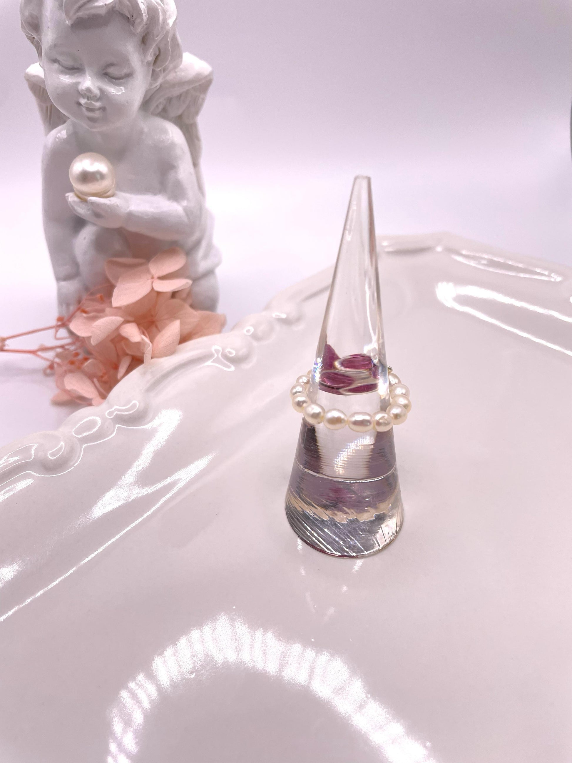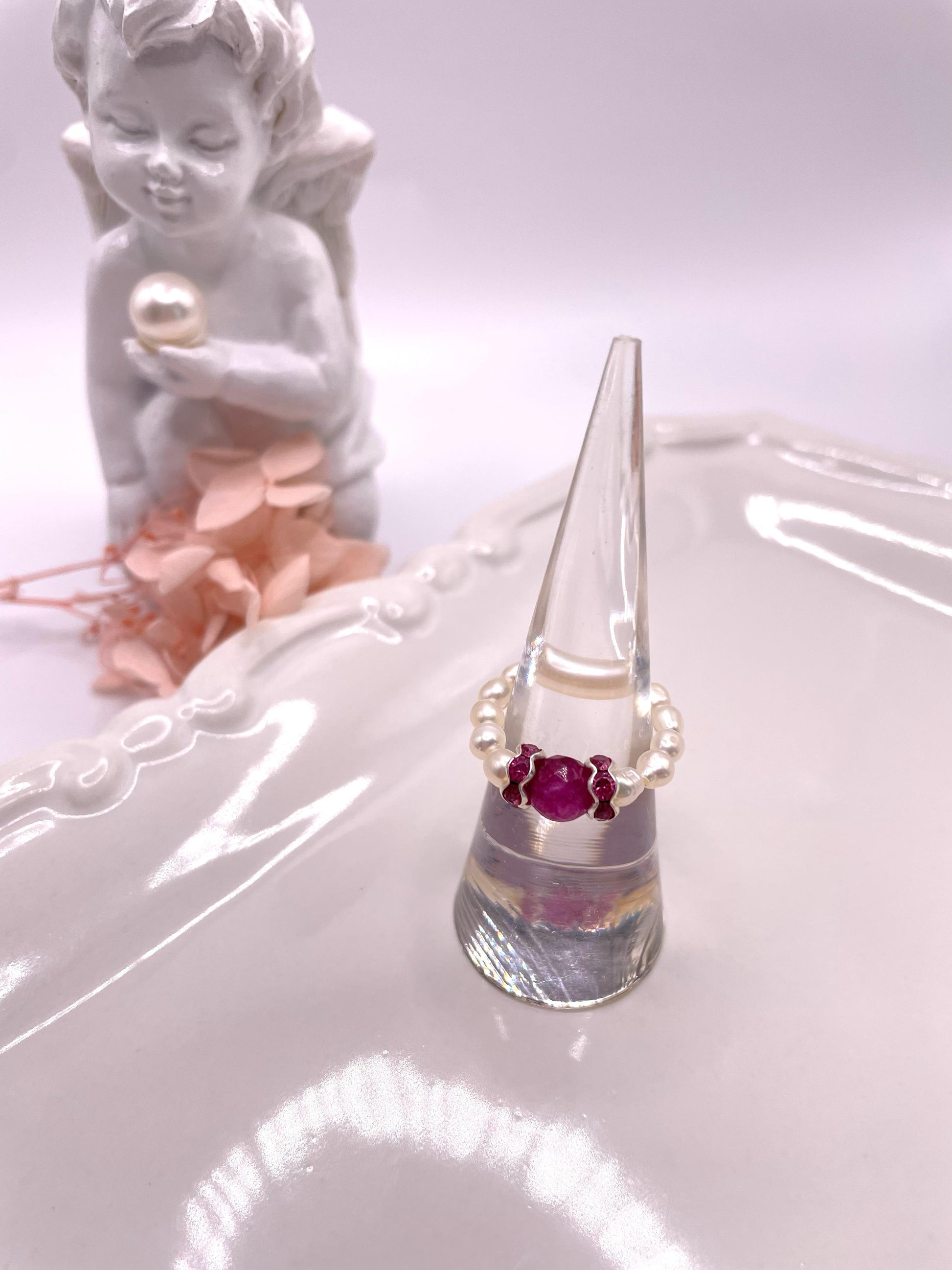 Dieser fein gearbeitete Ring aus kleinen Süßwasserperlen wirkt filigran und edel. Das sanft glänzende Weiß der Perlen legt sich zart um den Finger und unterstreicht die natürliche Schönheit der Trägerin. Im Mittelpunkt funkelt ein roter Turmalin, der dem Ring einen warmen, leidenschaftlichen Farbakzent verleiht.
