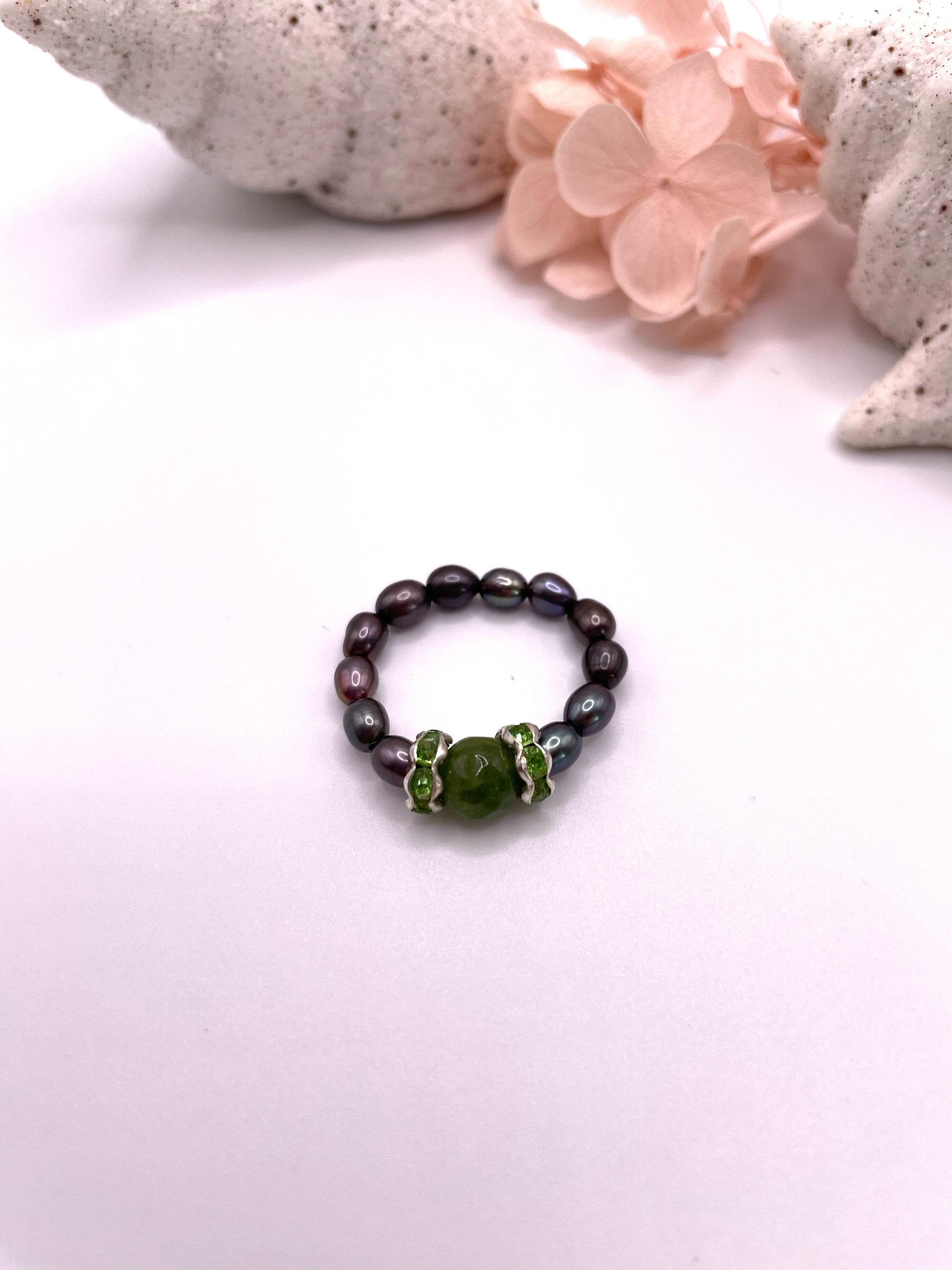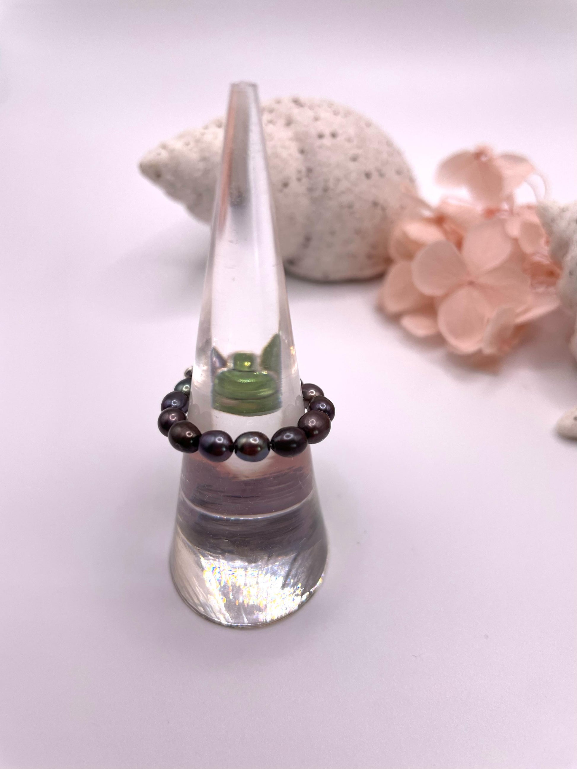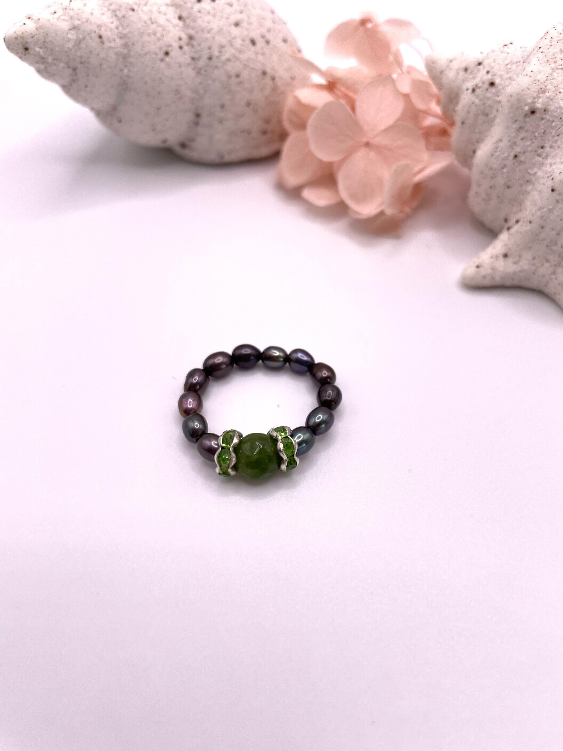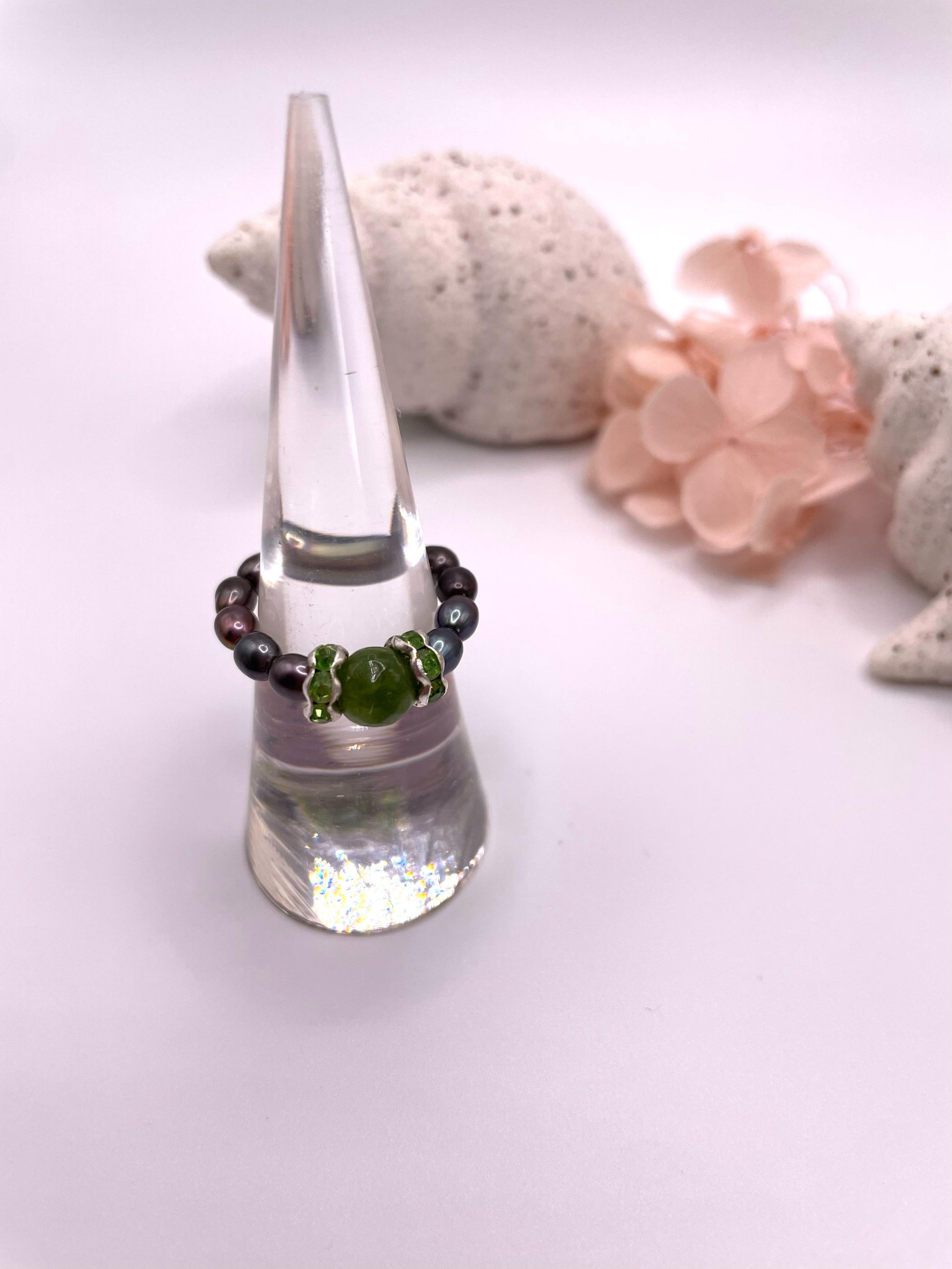 Dieser fein gearbeitete Ring aus kleinen Süßwasserperlen wirkt filigran und edel. Das sanft glänzende Braun der Perlen legt sich zart um den Finger und unterstreicht die natürliche Schönheit der Trägerin. Im Mittelpunkt funkelt ein grünerTurmalin, der dem Ring einen warmen Farbakzent verleiht.