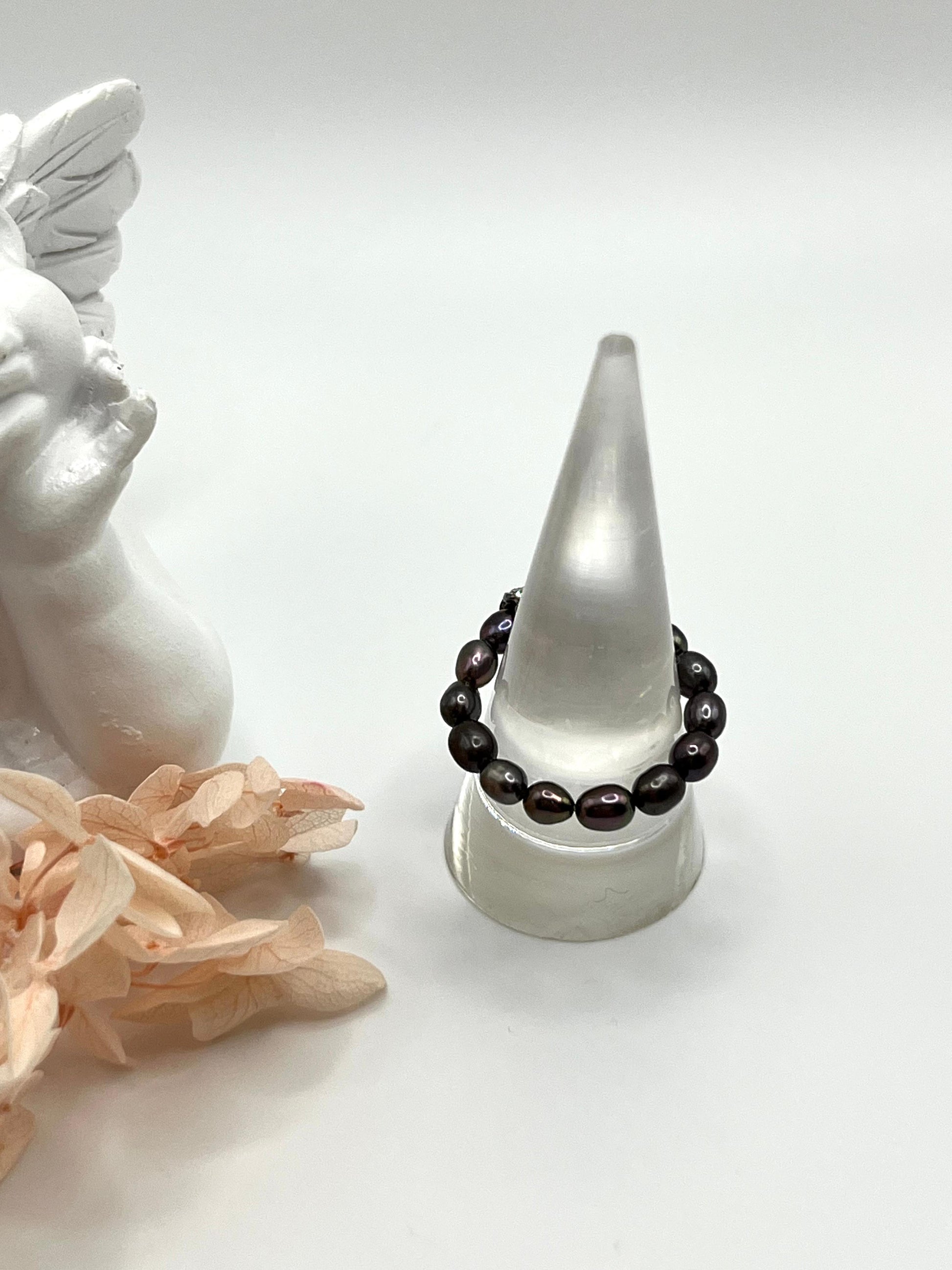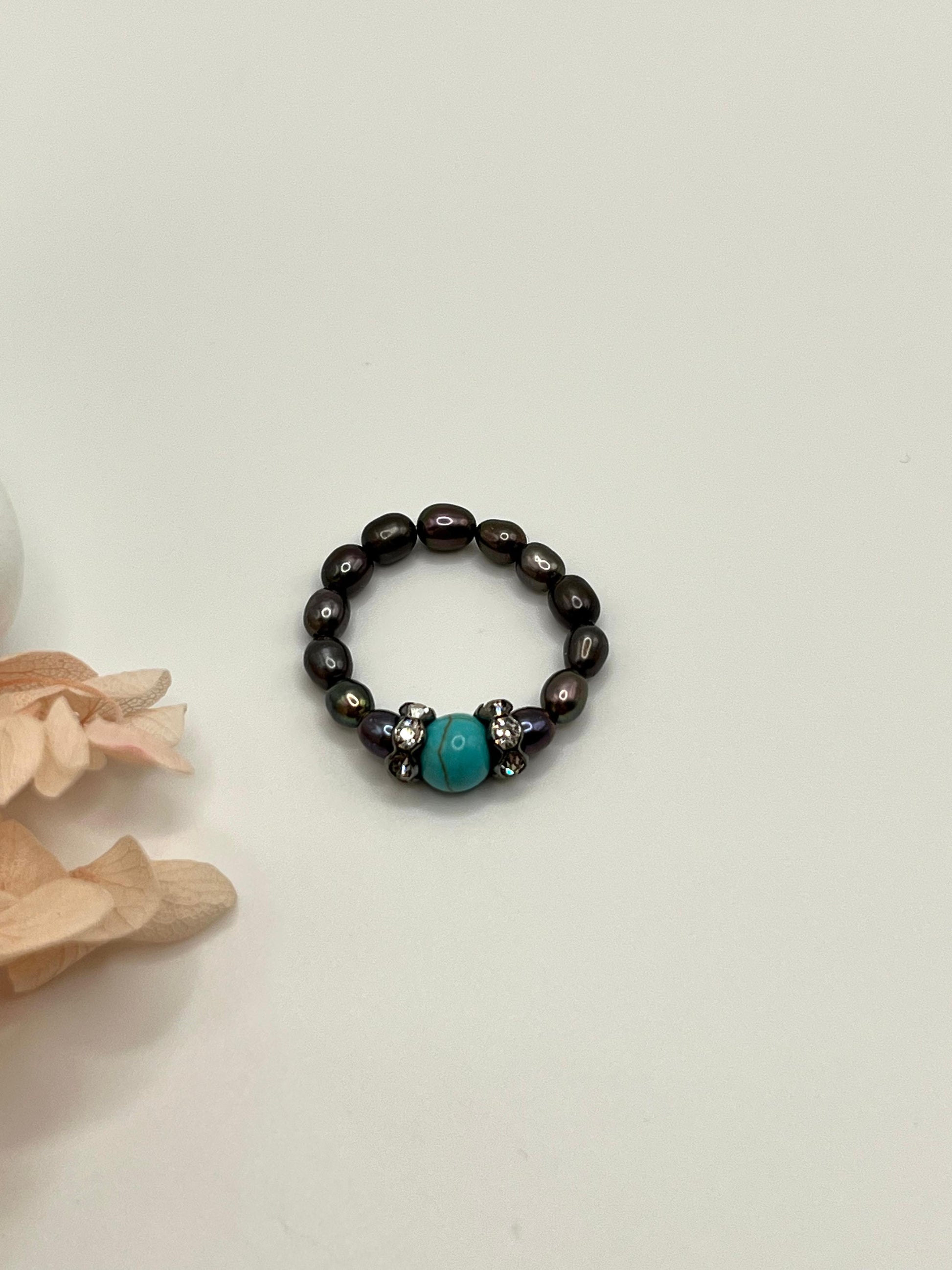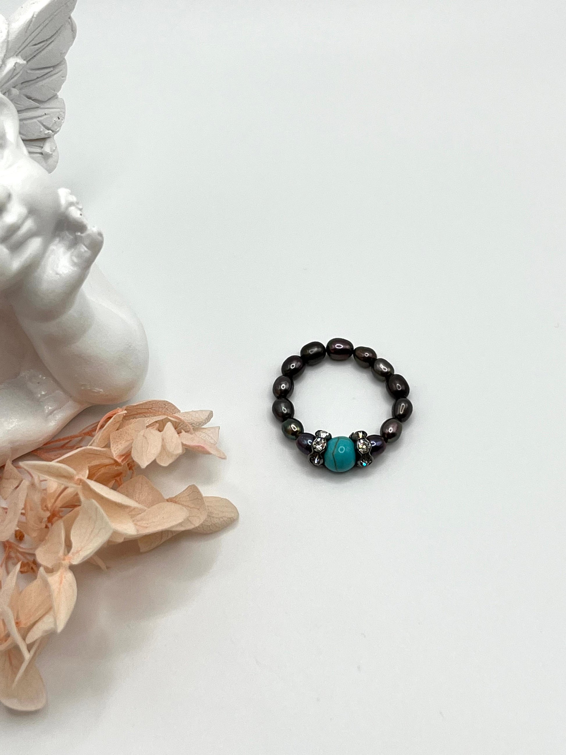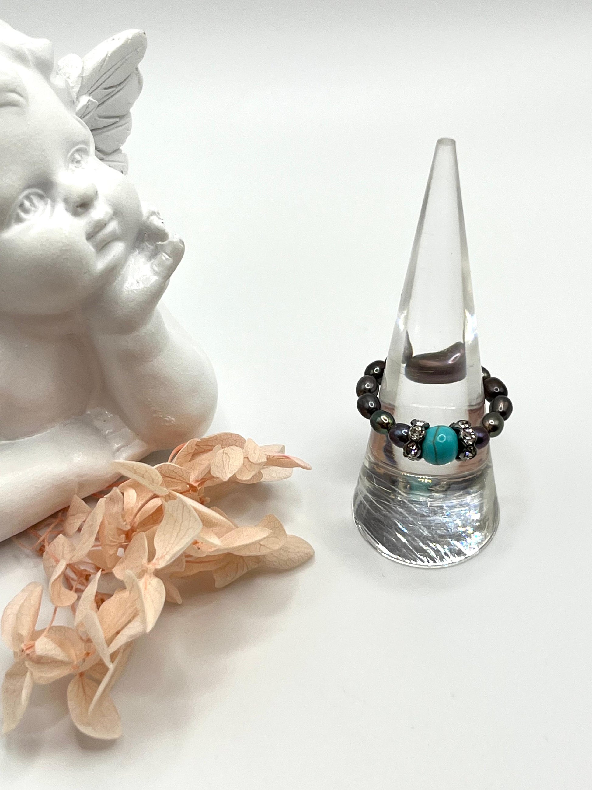 Dieser fein gearbeitete Ring aus kleinen Süßwasserperlen wirkt filigran und edel. Die sanft glänzenden Perlen legen sich zart um den Finger und unterstreicht die natürliche Schönheit der Trägerin. Im Mittelpunkt steht ein türkisfarbener Howlith, der dem Ring einen warmen, sommerlichen Farbakzent verleiht.