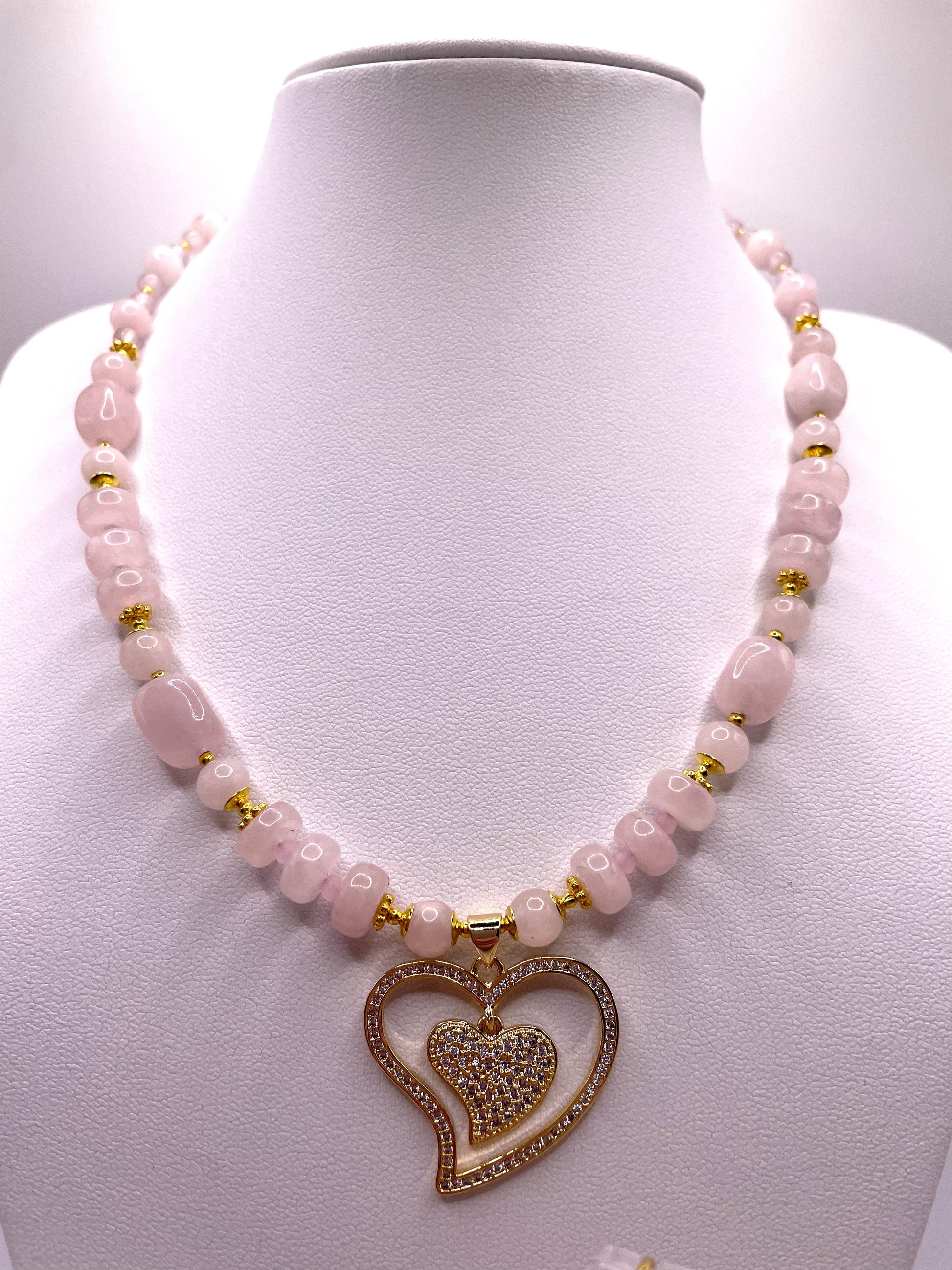 Die Kette ist ausschließlich aus Rosenquarz gefertigt, der Anhänger ist mit feinen Zirkonia Steinchen besetzt und ist 18 kt vergoldet.