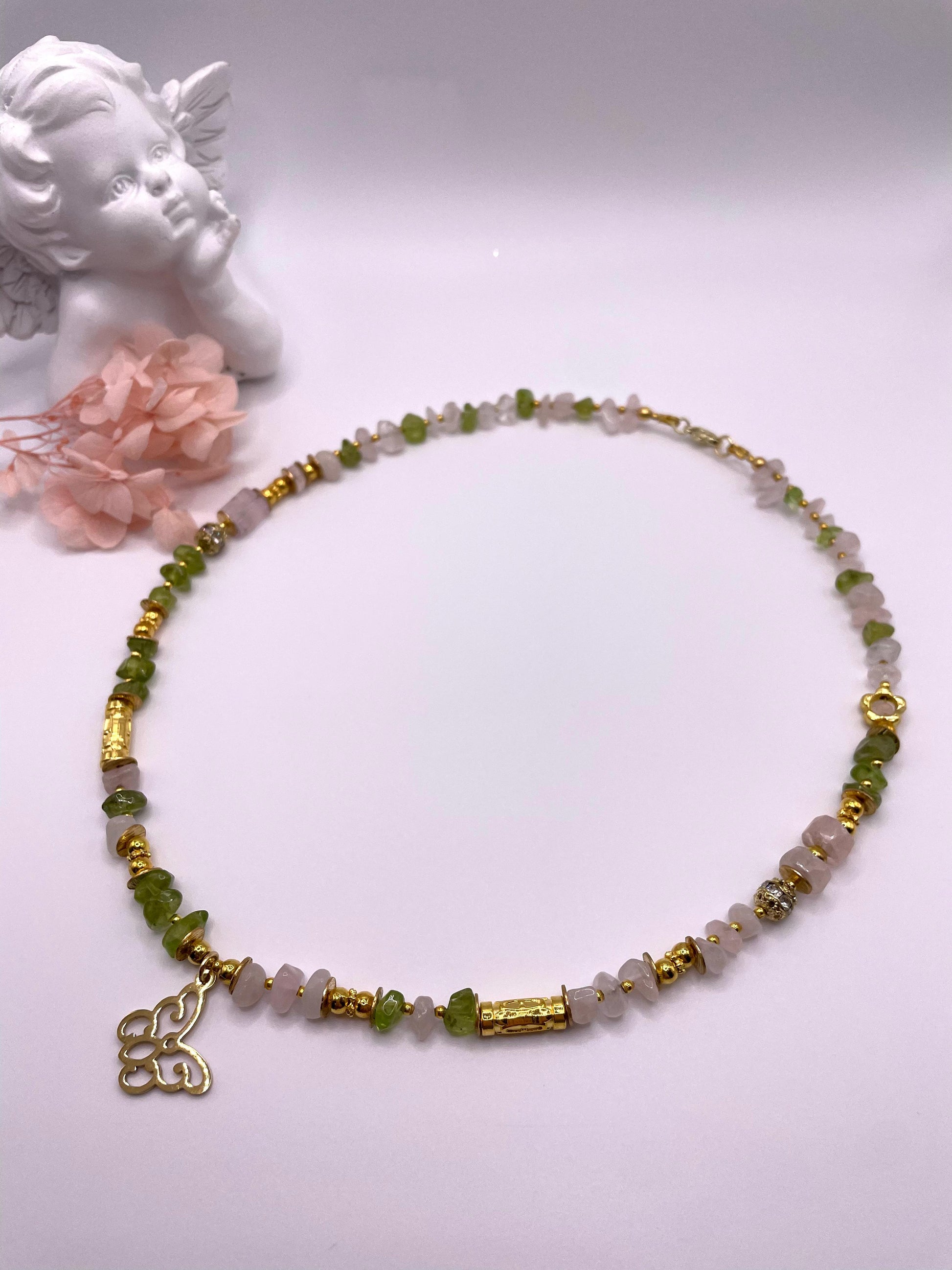 Rosenquarz, Peridot, zarte Edelsteinkette mit Schmetterling-Anhänger