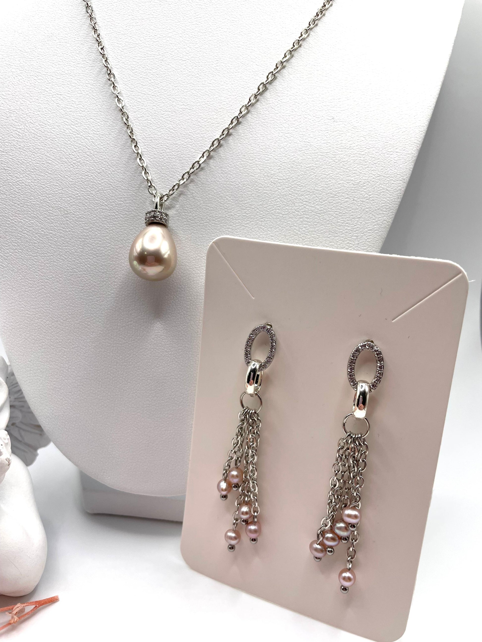 Die Perle an dem Anhänger ist eine Muschelperle im zarten altrosé Ton, die Perlen an den Ohrringe sind echte Süßwasserperlen.