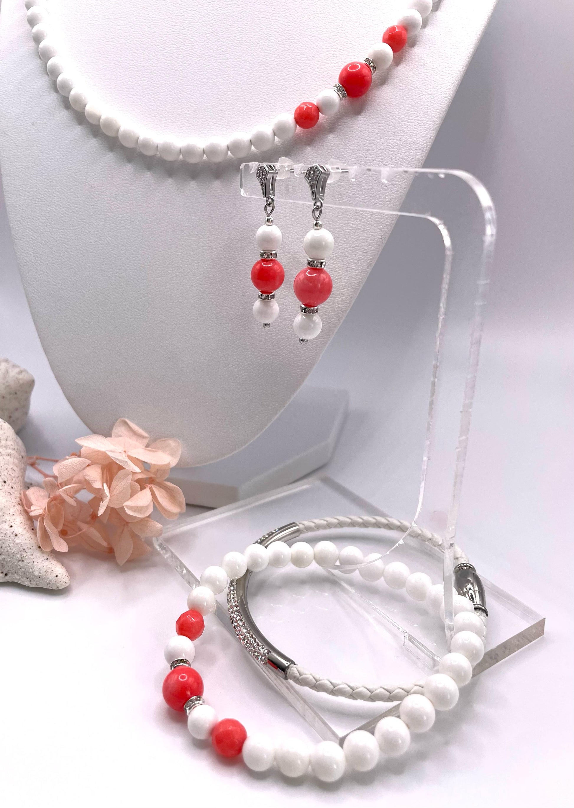 Schmuck-Set Tridacna Perlen und Koralle, Kette, 2x Armbänder, Ohrringe