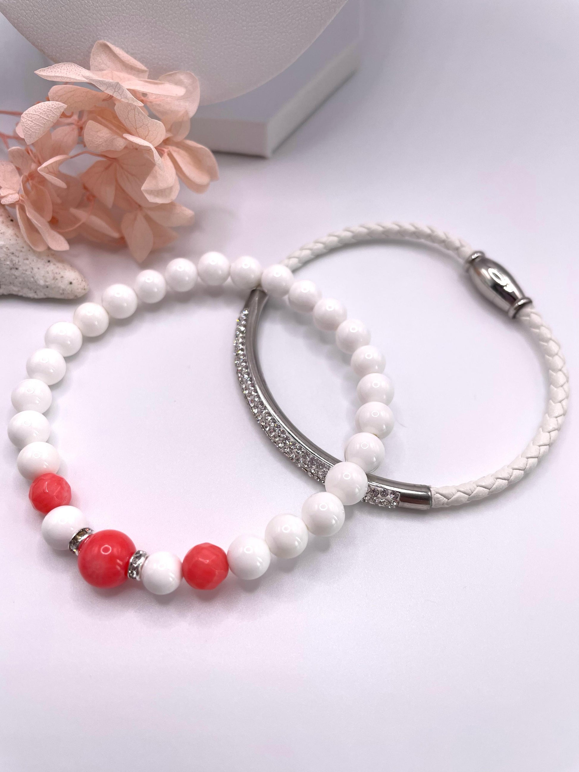 Zart, edel und voller Symbolkraft – dieses handgefertigte Schmuckset aus tiefweiß strahlenden Tridacna-Perlen und zarter Koralle verleiht jedem Look eine besondere Ausstrahlung.