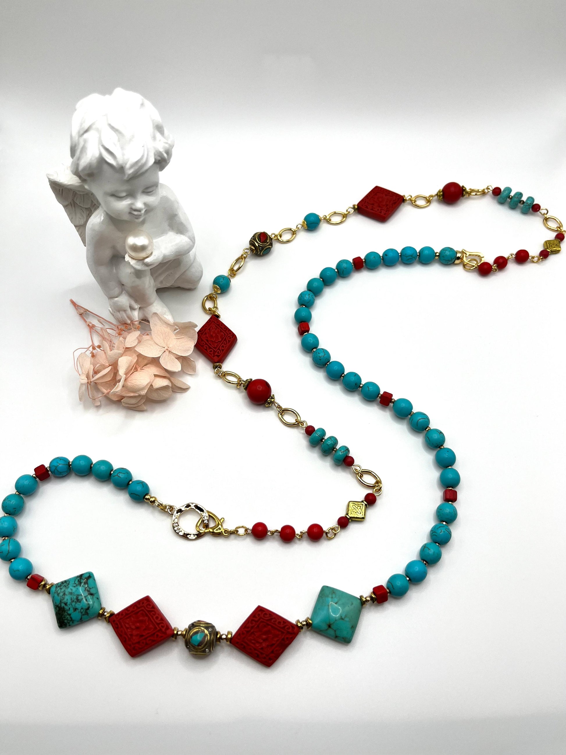Dieses handgemachte Schmuckset in leuchtendem Rot und Türkis versprüht pures Urlaubsfeeling – ideal für sonnige Tage und laue Nächte. Die türkisfarbenen Perlen aus Howlith stehen für Gelassenheit, innere Ruhe und fördern eine positive Ausstrahlung. Ein Hauch Boho, ein Hauch Abenteuer – perfekt für alle, die den Sommer lieben!