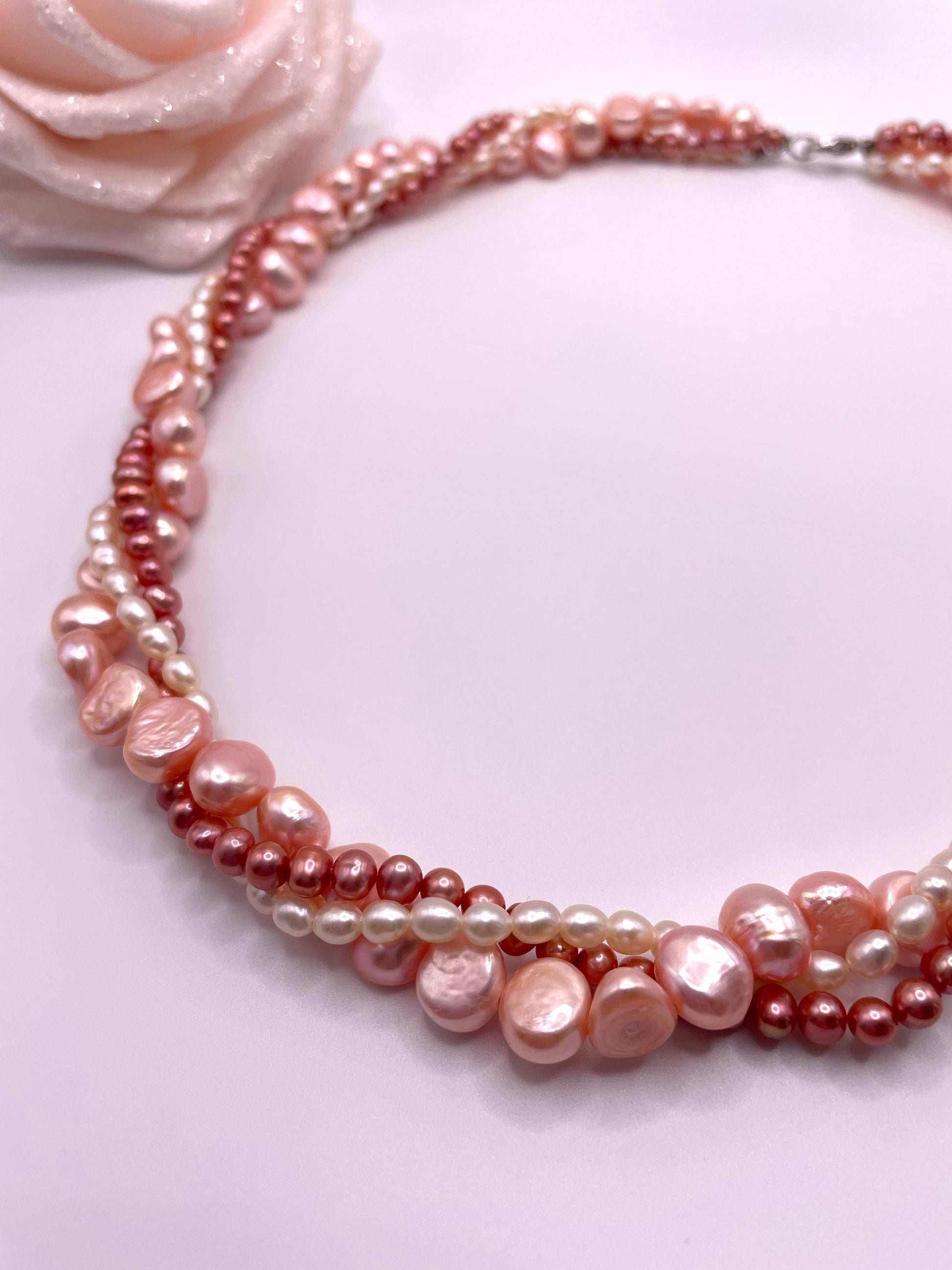 Eine außergewöhnliche Perlenkette aus drei unterschiedlichen Perlenarten in zarten Apricot - Rosé Farben. Die Kette liegt wunderbar am Dekollete, ist sehr edel und elegant. Mit diesem edlen Schmuckstück werden Sie alle Blicke auf sich ziehen.