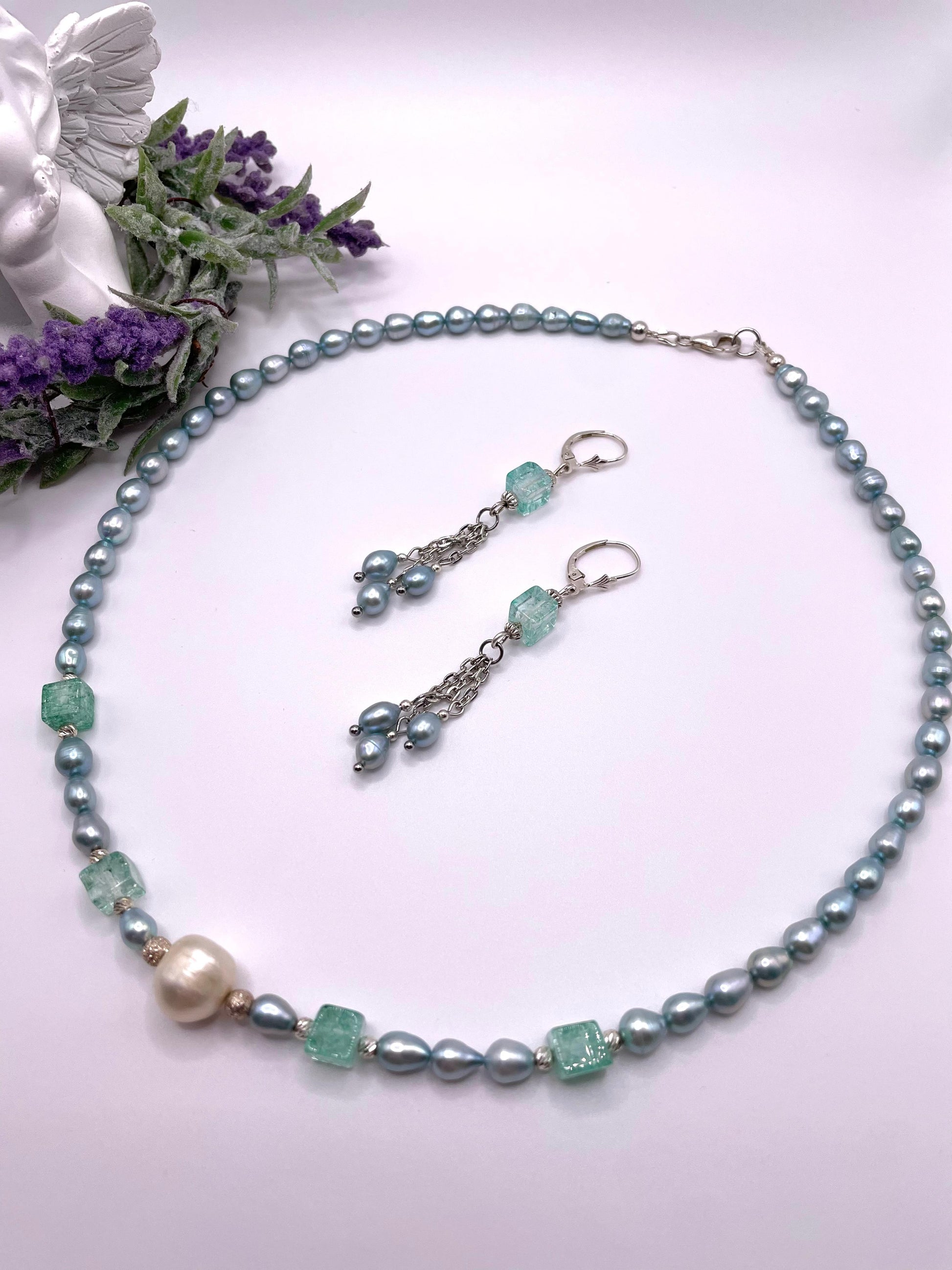 Süßwasserperlen, Schmuck-Set, Kette, Ohrringe im zarten mint