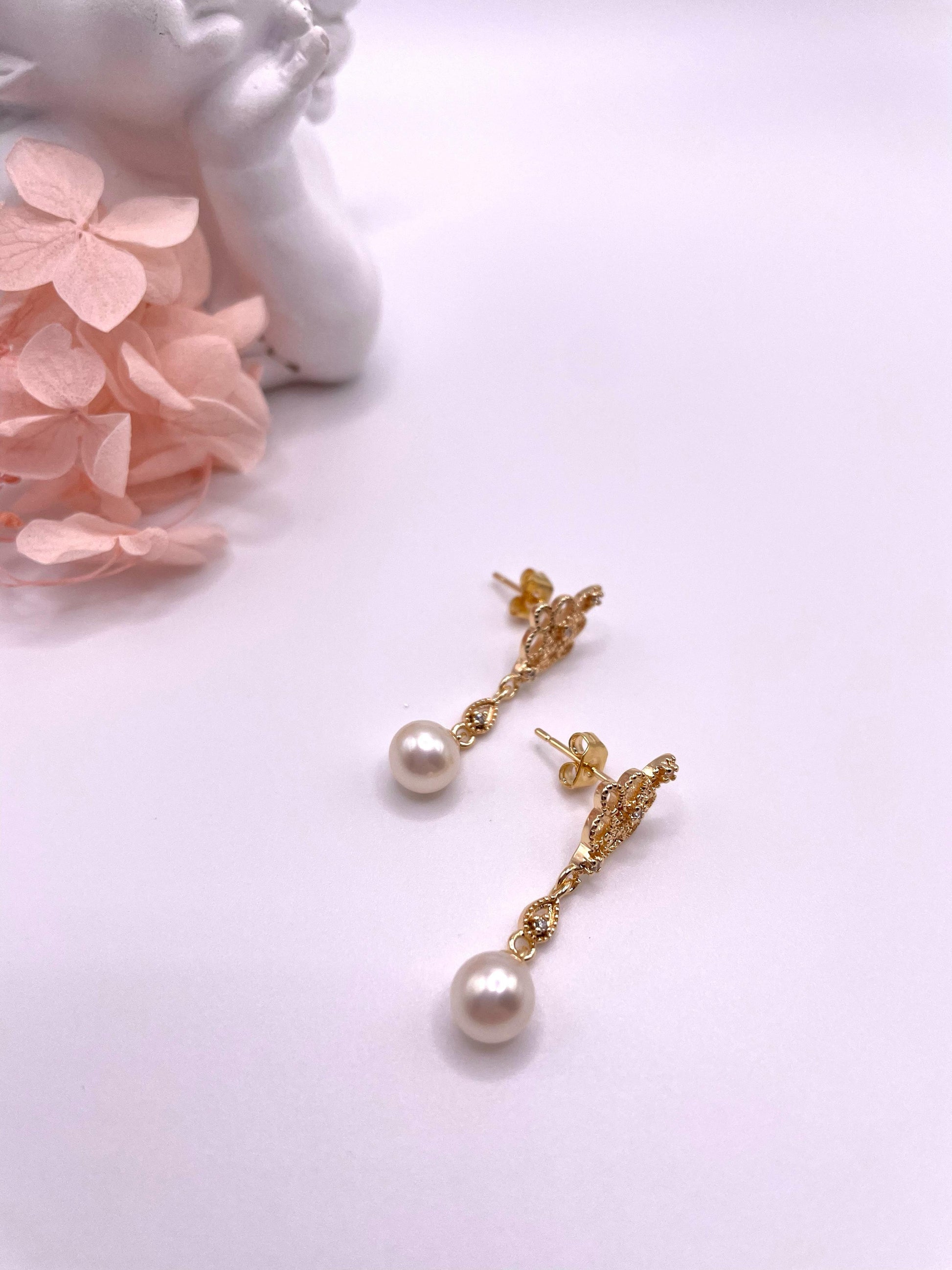 Wunderschöne Ohrringe, 18 kt vergoldet mit feinen Zirkonia Steinen und zarten Süßwasserperlen.